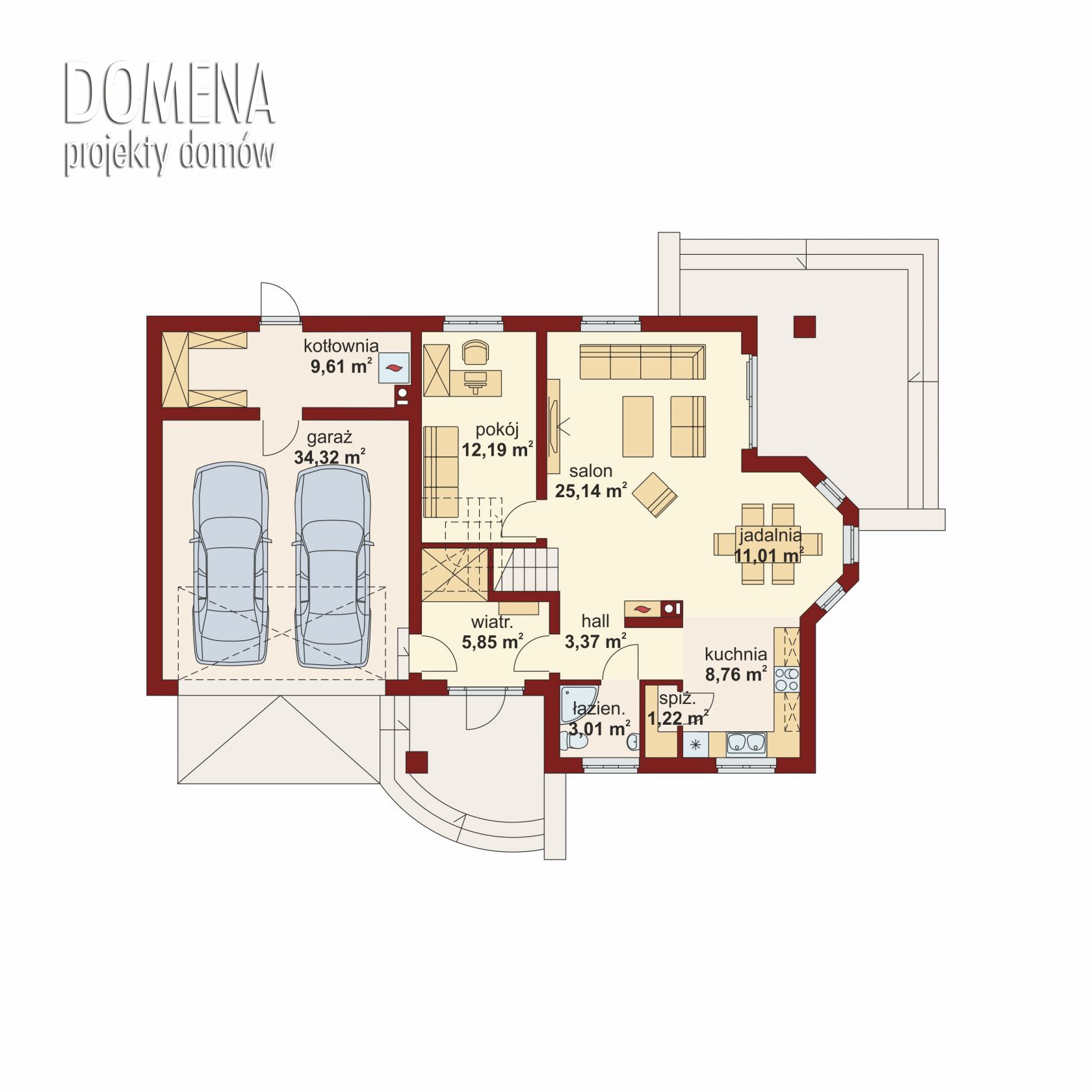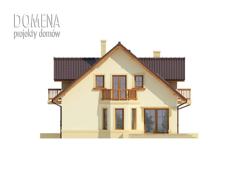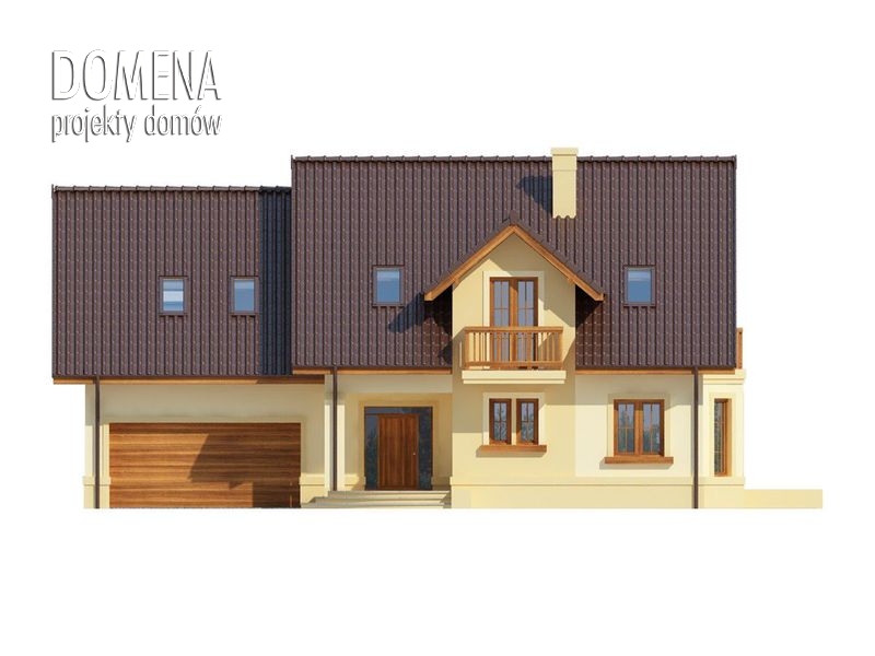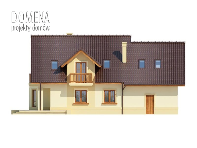 Dom z poddaszem użytkowym, przeznaczony dla 4-5-osobowej rodziny. Na parterze znajduje się przestronny pokój dzienny, jadalnia oraz otwarta kuchnia. Wyjście na taras z podcieniem jest możliwe zarówno z salonu jak i dodatkowego pokoju, który może pełnić funkcję gabinetu. Na poddaszu znajdują się trzy sypialnie, z których każda posiada indywidualną garderobę, oraz przestronna łazienka. Główna sypialnia posiada ponadto drugą garderobę i własną łazienkę. Nad garażem można zaadaptować strych nieużytkowy, dostępny bezpośrednio z klatki schodowej, na dodatkowe pomieszczenie gospodarcze lub pokój.