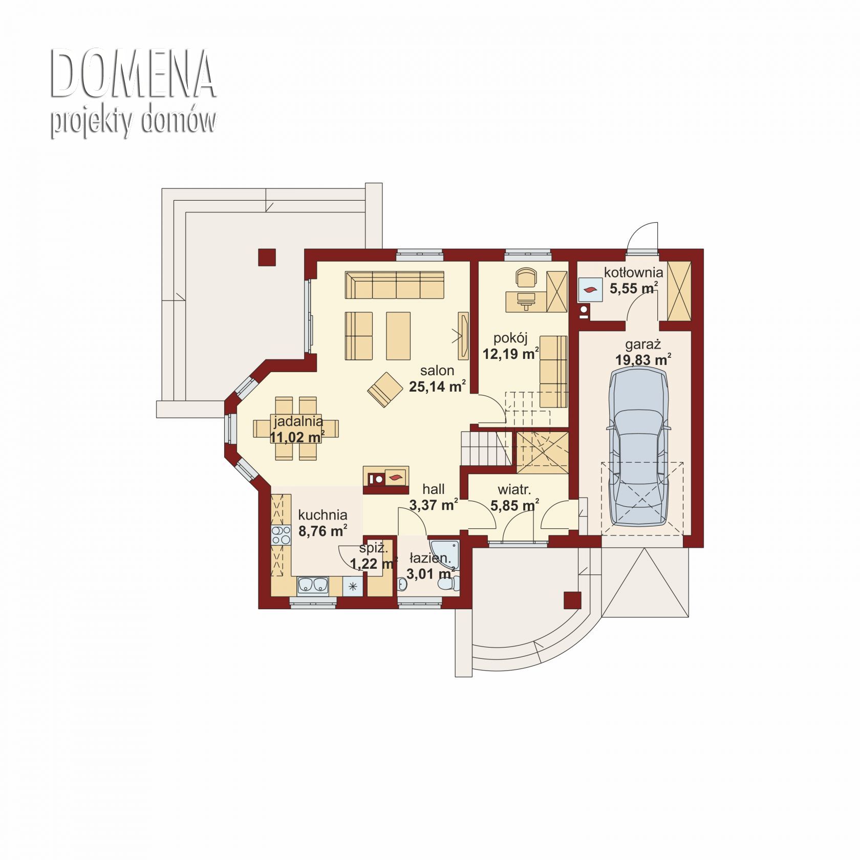 Dom z poddaszem użytkowym, przeznaczony dla 4-5-osobowej rodziny. Na parterze znajduje się przestronny pokój dzienny, jadalnia oraz otwarta kuchnia. Wyjście na taras z podcieniem jest możliwe zarówno z salonu jak i z dodatkowego pokoju, który może pełnić funkcję gabinetu. Na poddaszu znajdują się trzy sypialnie, z których każda posiada indywidualną garderobę, oraz przestronna łazienka. Nad garażem można zaadaptować strych nieużytkowy dostępny bezpośrednio z klatki schodowej na dodatkowe pomieszczenie gospodarcze lub pokój.