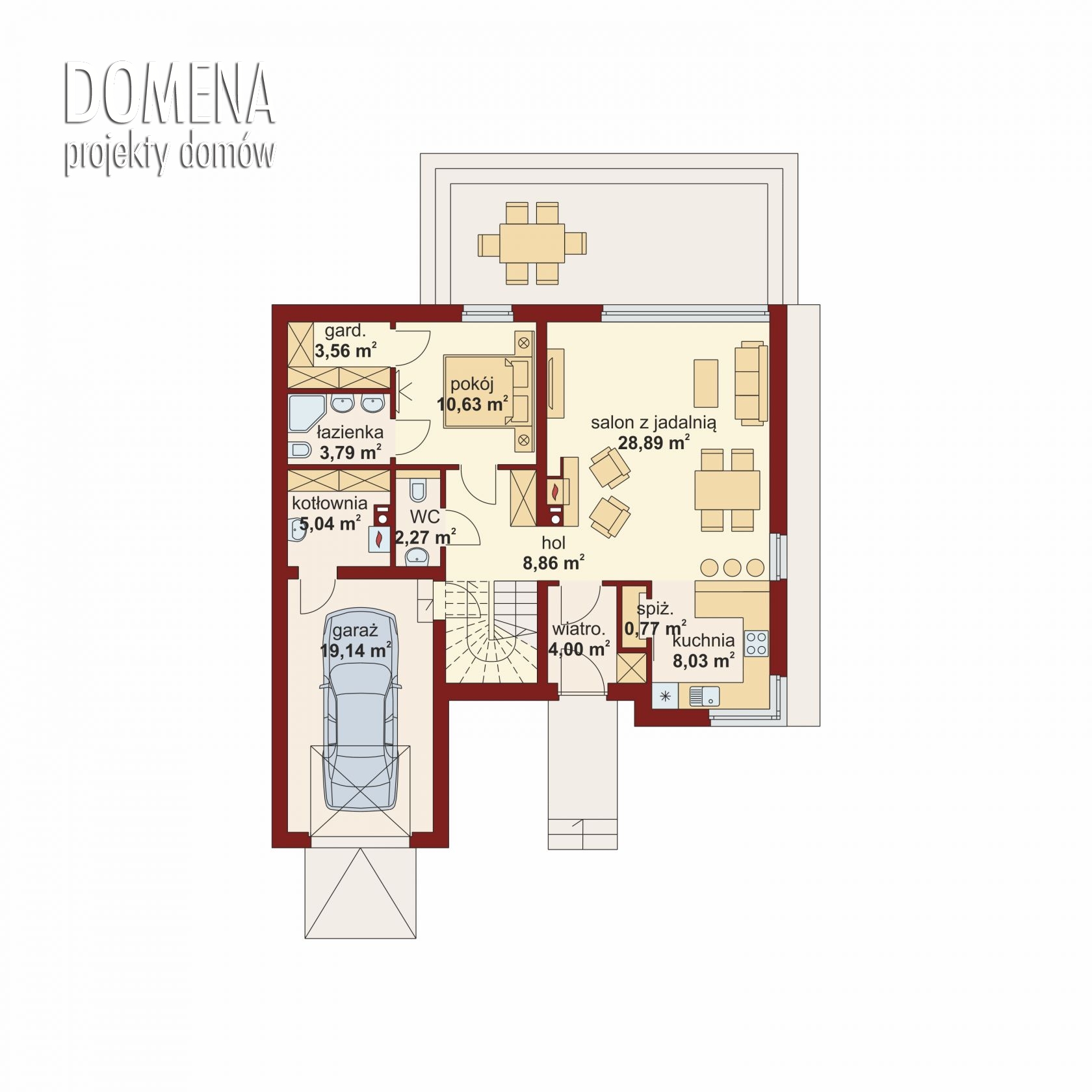 Klasyczny w formie, niewielki dom doskonale nadający się zarówno na miejską jak i podmiejską działkę. Amoniusz przeznaczony jest dla 4-5 osobowej rodziny ceniącej czytelnie rozwiązane układy pomieszczeń i energooszczędność. Na szczególną uwagę zasługuje tu umieszczenie sypialni małżeńskiej wraz z garderobą i łazienką na parterze domu, dzięki czemu na etapie życia, gdy dzieci opuszczają dom rodzinny poddasze może zostać wyłączone z użycia, przez co znacznie można zyskać na kosztach eksploatacyjnych budynku. Po lewej stronie od wejścia znajduje się część dzienna mieszcząca jednorodną przestrzeń kuchni oraz salonu z jadalnią z dużym przeszkleniem powodującym wizualne włączenie ogrodu do pokoju. W ramach adaptacji kuchnię można oddzielić ścianką działową, a w miejscu spiżarni zamontować wysoką, pojemną szafkę. Na parterze w strefie gospodarczej znajduje się garaż z przejściem do części mieszkalnej, oraz kotłownia. Poddasze mieści trzy sypialnie, obszerną łazienkę i dostępną z korytarza garderobę. Gabinet może być kolejną sypialnią, lub pokojem hobby, zgodnie z potrzebami rodziny.