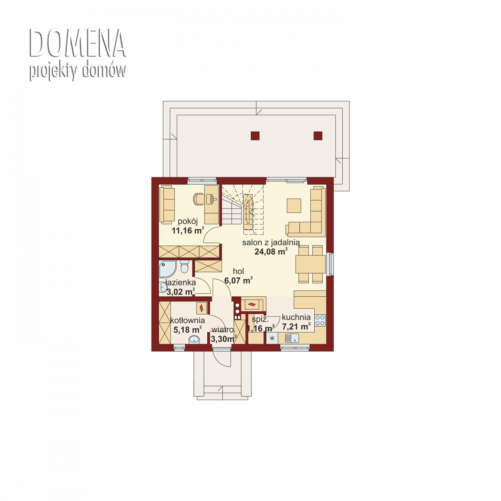 Aspazja 3 jest domem świetnie wpisującym się w niewielką działkę. Jest stworzony dla rodziny 4-5 osobowej z upodobaniem do rozwiązań prostych i nowoczesnych. Dom generalnie dzieli się na 2 części – dzienną oraz nocną. Ta pierwsza to salon z jadalnią i otwarta na nie kuchnia ze spiżarnią. Zwolennicy kuchni zamkniętych mają możliwość rozdzielenia jej od pozostałej powierzchni ścianką działową. W zacisznej tylnej części budynku zaprojektowano pokój z sąsiadującą z nim łazienką z natryskiem. Dzięki temu bardzo dobrze spełni rolę pokoju gościnnego, kolejnej sypialni, czy pokoju hobby. Druga część budynku to strefa nocna. Mieści się ona na poddaszu domu. Składa się z trzech sypialni oraz łazienki z praktycznie wydzielonym aneksem na pralnię/suszarnię.