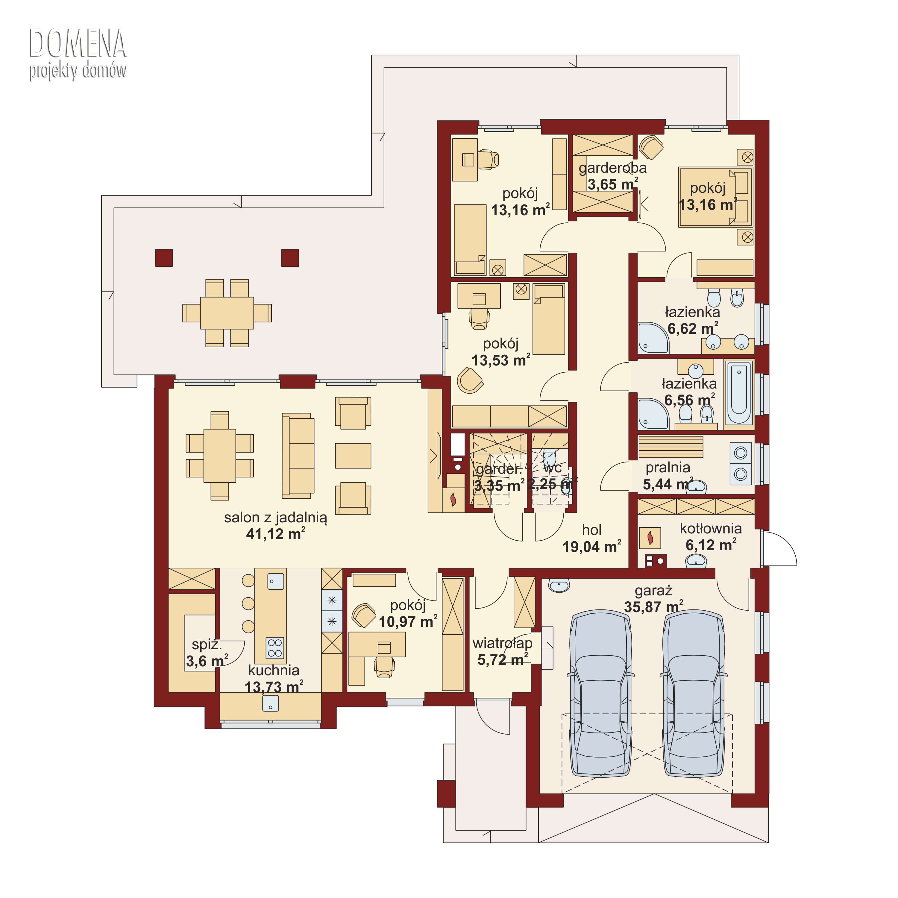 Przemyślnie zlokalizowany przedsionek zapewnia jednocześnie dostęp do strefy dziennej, nocnej i gospodarczej oraz, w przypadku adaptacji poddasza – opcjonalnych schodów. Strefa dzienna składa się z okazałego salonu połączonego z jadalnią (rozbudowanych o wyjście na zadaszony taras), imponującej otwartej kuchnią (którą z łatwością można też częściowo lub całkowicie zamknąć) oraz pojemnej spiżarni. Uzupełnieniem tej części domu jest dodatkowy pokój, z racji bliskości wejścia mogący szczególnie dobrze pełnić funkcję domowego biura (istnieje nawet możliwość zapewnienia dostępu do niego przez przedsionek lub wręcz bezpośrednio z zewnątrz budynku). W przejściu ze strefy dziennej do nocnej znajduje się podręczna garderoba i toaleta. Część nocna, umiejscowiona w gwarantującej ustronność części budynku, składa się z trzech dużych sypialni (głównej dodatkowo z własną garderobą i łazienką), oraz ogólnodostępnej łazienki i pralni. Dostępny z przedsionka dwustanowiskowy garaż, zapewnia też połączenie z ładownym pomieszczeniem gospodarczym, posiadającym praktyczne wyjście do ogrodu.