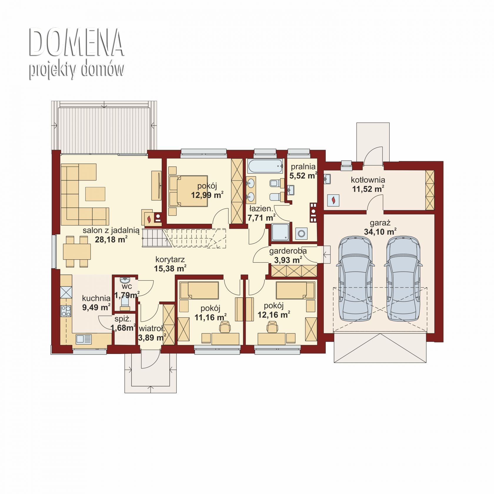 ATLANT 2 PS to projekt stworzony z myślą o 4-osobowej rodzinie. Rezygnując ze ścianki w wiatrołapie można prawie dwukrotnie przedłużyć ciąg szaf, ale zachowując ją mamy bufor dla zimnego powietrza z zewnątrz, a od strony holu jest miejsce drugą szafę. Kuchnię można częściowo oddzielić meblami tworząc barek, ale też zupełnie zamknąć (jest tam wystarczająco dużo miejsca by zmieścić w niej wtedy mały stół), natomiast spiżarnię, w zależności od upodobań, można przeznaczyć na miejsce dla dodatkowych szaf kuchennych czy powiększenie przestrzeni na odzież w wiatrołapie. Na wprost wejścia zaprojektowano schody wiodące na poddasze w zamkniętej klatce schodowej. Rozwiązanie to pozwala na przygotowanie domu do zaaranżowania strychu na późniejszym etapie budowy i nie ogrzewanie niepotrzebnie tej przestrzeni w sezonie zimowym. W przypadku, gdy nie przewidujemy adaptacji strychu schody można zlikwidować, przeznaczając to miejsce na kolejne schowki czy szafy.