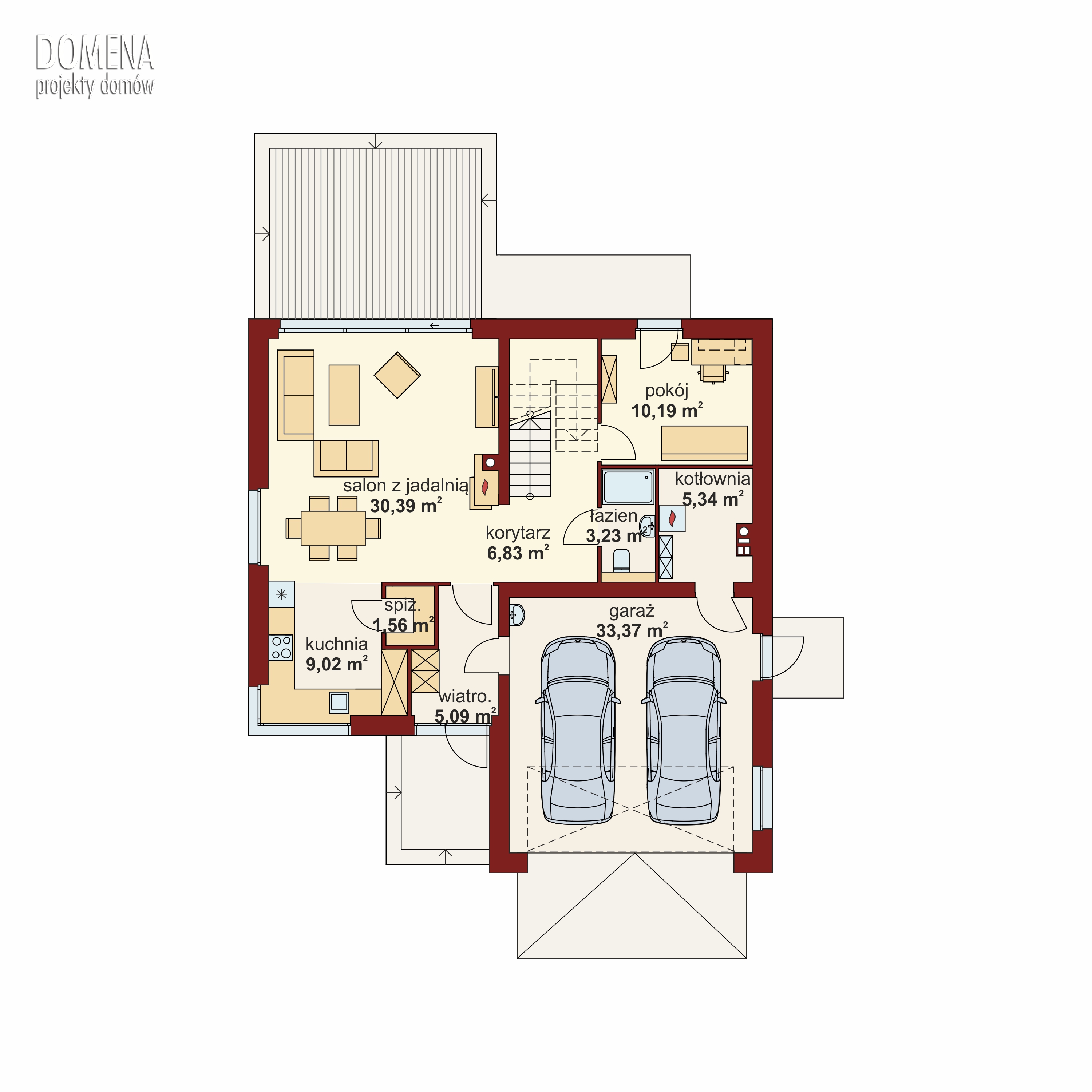 BRUNO B1 to dom parterowy z poddaszem użytkowym, zaprojektowany dla 4-5-osobowej rodziny. Za wyposażonym w praktyczną garderobę wiatrołap, po jednej stronie ukazuje się obszerny salon z jadalnią i wejście do kuchni. Oddzieloną kuchnię można z łatwością połączyć z salonem. Dopełnieniem dla kuchni jest użyteczna spiżarnia. Na parterze znajduje się także pokój, który może pełnić rolę gabinetu, pokoju gościnnego lub kolejnej sypialni oraz łazienka. Z przedsionka dostępna jest również dwustanowiskowy garaż z funkcjonalnym przejściem do dużej kotłowni, z której z kolei możemy dostać się bezpośrednio na zewnątrz budynku. Na poddaszu znajduje się strefa nocna domu, która składa się z trzech sypialni, ogólnodostępnej łazienki połączonej z praktyczną pralnią oraz dostępnej z korytarza garderoby.