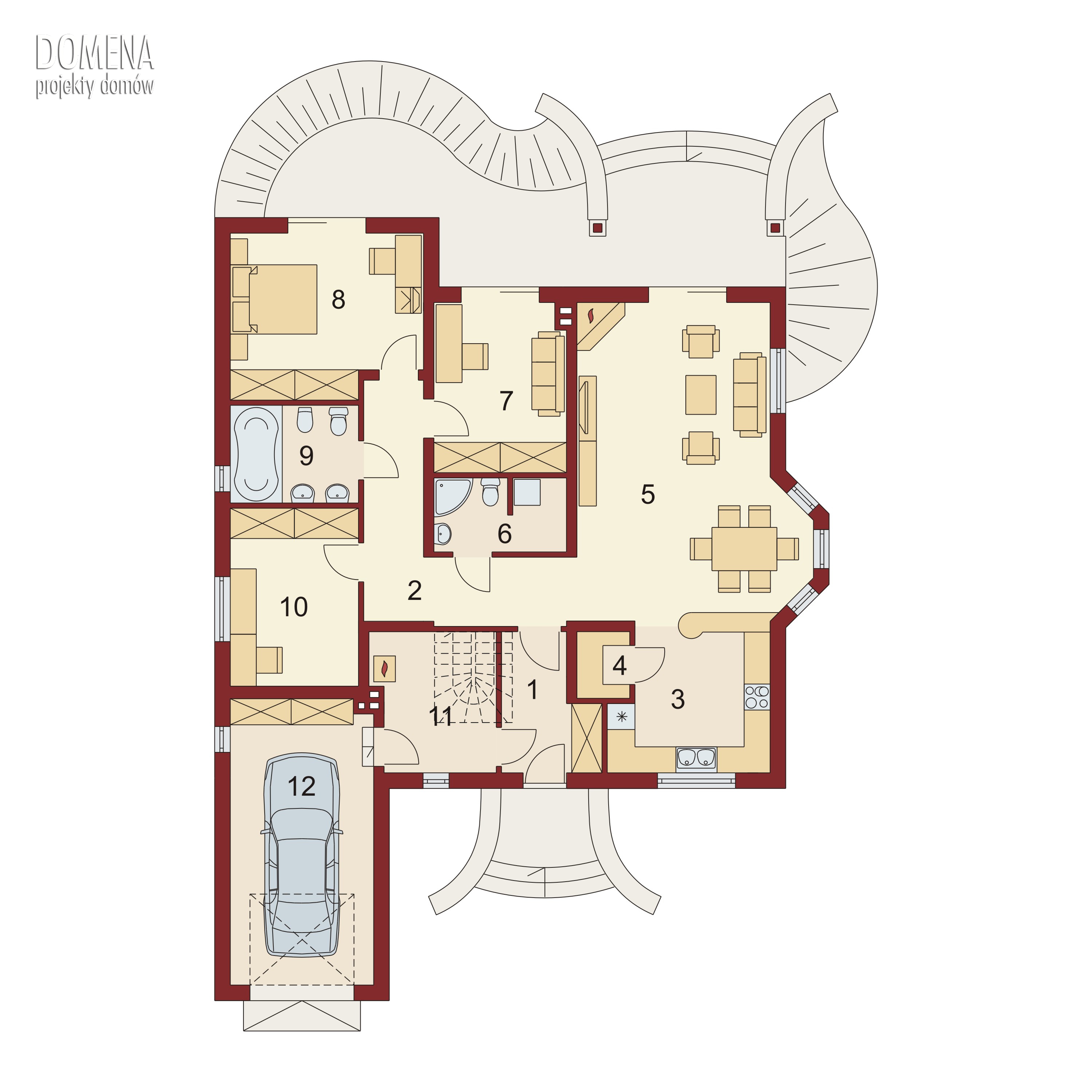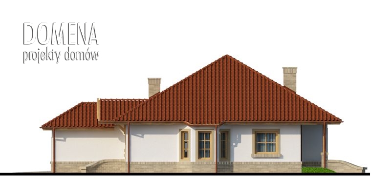 Brutus, to parterowy dom zaprojektowany dla 4-osobowej rodziny. Zaakcentowana strefa wejściowa z praktycznym zadaszeniem wprowadza do wiatrołapu, z którego dostępna jest zarówno strefa gospodarcza z kotłownią i jednostanowiskowym garażem, jak i strefa dzienna. Ta ostatnia to jednorodna przestrzeń, podzielona funkcjonalnie na salon z kominkiem i szerokim widokiem na duży zadaszony taras, ciekawie umieszczoną w słonecznym wykuszu jadalnię oraz kuchnię ze spiżarnią. Jest także możliwość stworzenia kuchni zamkniętej, dzięki zastosowaniu ścianki działowej na jej granicy z jadalnią. Strefę nocną stanowią 3 sypialnie, z których dwie posiadają bezpośrednie wyjście na taras oraz usytuowana komfortowo w centrum strefy łazienka. Jest możliwość powiększenia powierzchni użytkowej o przestrzeń na poddaszu. Schody na nie prowadzące można wydzielić we fragmencie kotłowni i górnej części wiatrołapu z wejściem od strony korytarza. Uzyskaną przestrzeń można przeznaczyć na kolejną sypialnię, czy np. pokój hobby.