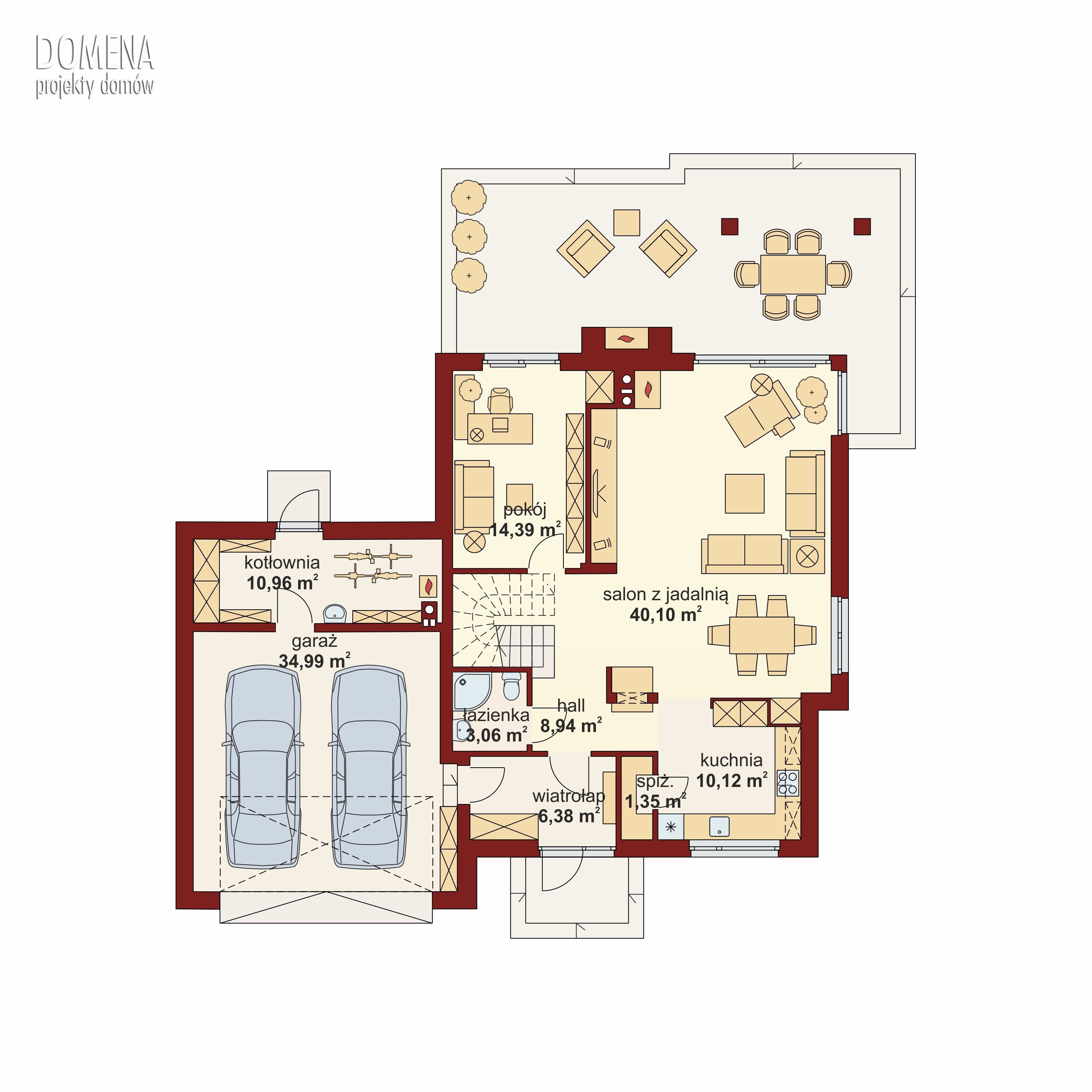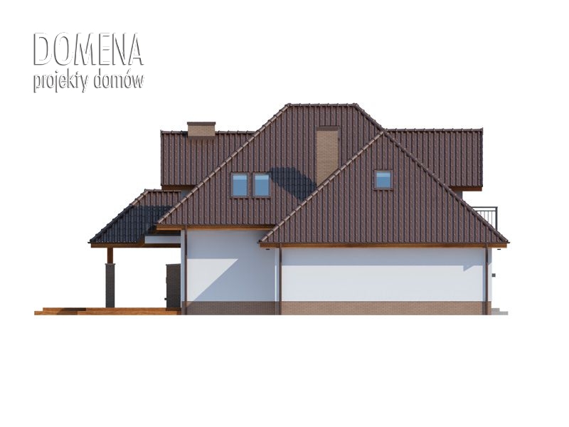 CELINA 2 PS to dom parterowy z poddaszem użytkowym, zaprojektowany dla 4-5-osobowej rodziny. Wiatrołap z miejscem na szafę wiedzie do przestronnego salonu połączonego z jadalnią. Przylegającą kuchnię, częściowo wydzieloną ścianą działową, można całkowicie zamknąć lub otworzyć na resztę strefy dziennej. Na parterze zlokalizowano też gabinet, mogący pełnić funkcję pokoju gościnnego lub kolejnej sypialni, oraz łazienkę. Poprzez wiatrołap dostępny jest również dwustanowiskowy garaż i usytuowane za nim, obszerne pomieszczenie gospodarcze z praktycznym wyjściem do ogrodu. Na poddaszu znajdują się trzy duże sypialnie i salon łazienkowy wraz z dostępną z niego sporą pralnią, oraz garderoba i dodatkowa łazienka, dostępne z głównej sypialni.