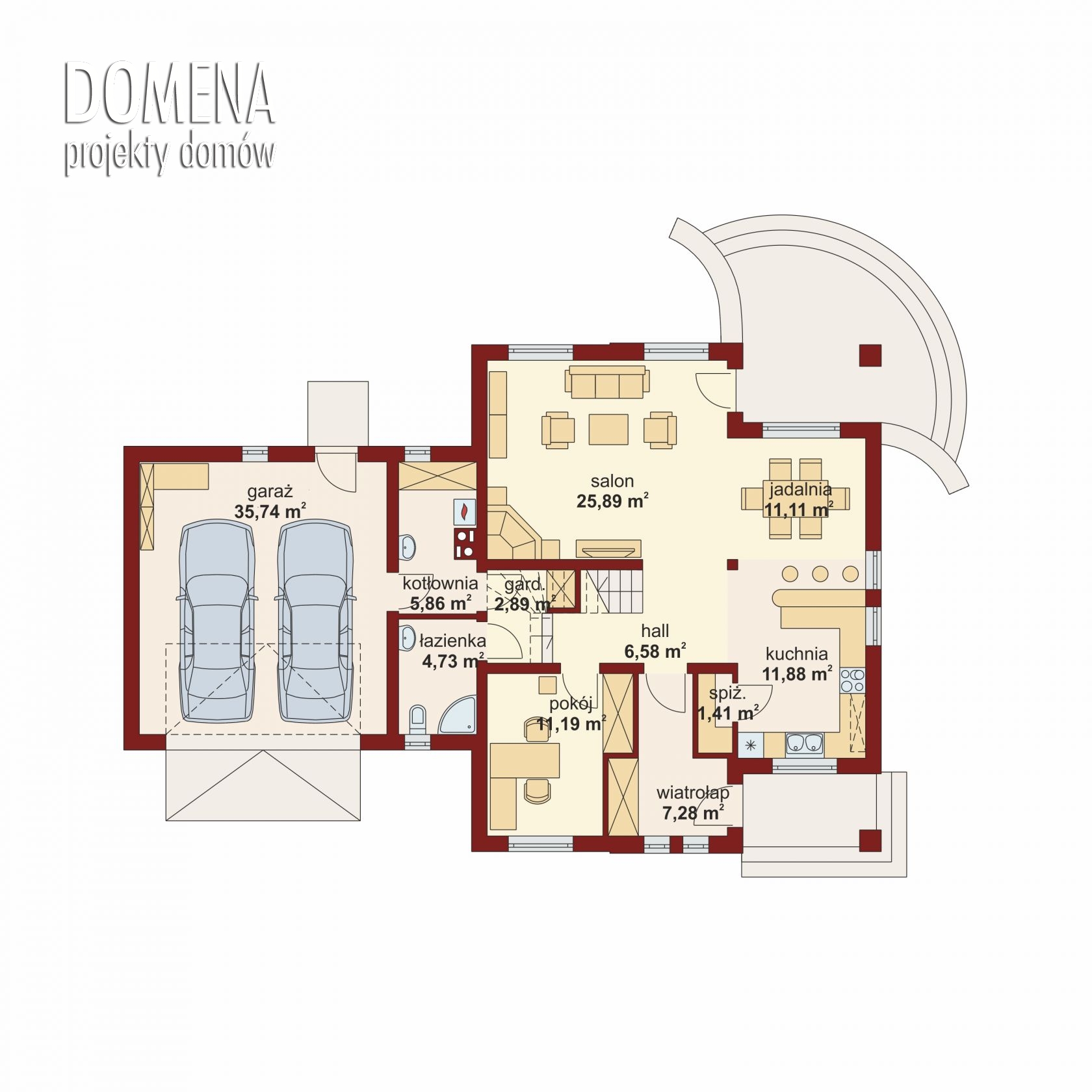 Damokles 2 jest domem zaprojektowanym dla 4/5-osobowej rodziny. Dzięki swojej klasycznej formie łatwo wpisuje się w otaczającą zabudowę. Minąwszy zadaszoną strefę wejściową oraz wiatrołap z pojemną szafą wnękową, wkraczamy do części dziennej budynku. Otwarta jasna przestrzeń z widokiem na ogród i częściowo przekryty taras składa się na przestronny salon z kominkiem, oraz jadalnię i kuchnię, przedzielone barkiem. Kuchnię zaprojektowaną jako otwartą można z łatwością przekształcić w zamkniętą, dzięki zastosowaniu ścianki działowej. Usytuowanie dodatkowego pokoju w pobliżu strefy wejściowej jest praktycznym rozwiązaniem szczególnie w przypadku użytkowania go jako gabinetu, czy pokoju gościnnego. Jest możliwość powiększenia go kosztem wiatrołapu, bądź uzyskania dodatkowego miejsca na szafę w wiatrołapie, redukując z kolei powierzchnię pokoju. Część gospodarczą stanowi kotłownia, z wejściem od strony mieszkalnej i garażu oraz obszerny dwustanowiskowy garaż, do którego dostać się można zarówno z części mieszkalnej, od frontu domu jak i od strony ogrodowej. Całość poddasza to strefa nocna. Znajdują się tu trzy sypialnie, każda z wyjściem na indywidualny balkon. Największa z sypialni ma dodatkowo dostęp do osobnej garderoby. Jest możliwość zaadaptowania części nieużytkowej – strychu na powierzchnię użytkową i zastosowania jej jako dodatkową sypialnię czy pokój hobby.