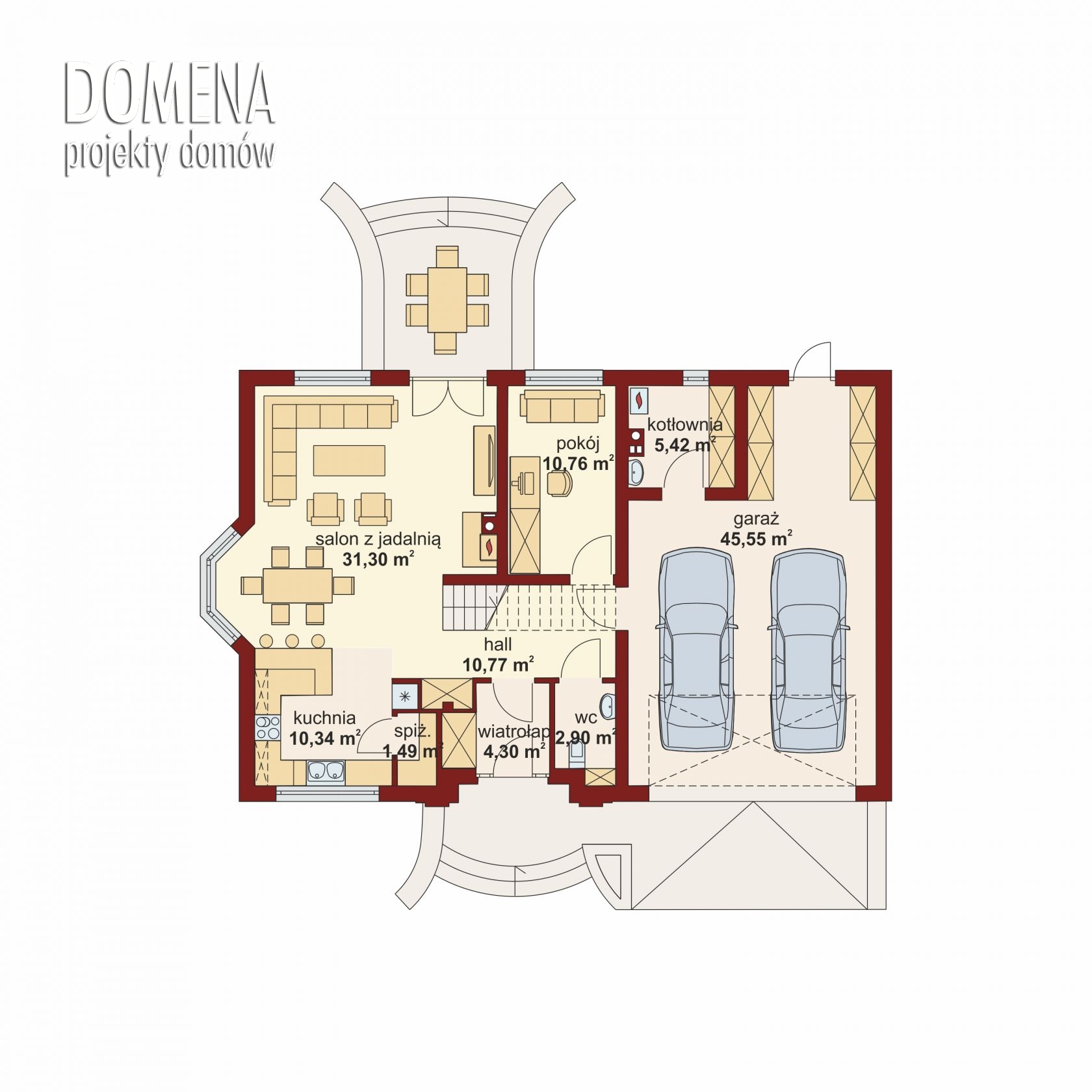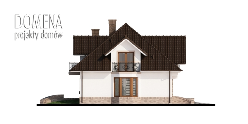 Diogenes 2 to dom z założenia zaprojektowany dla 5/6 – osobowej rodziny. Posiada klasyczną formę oraz prosty, a zarazem funkcjonalny rzut. Umieszczone osiowo wejście posiada praktyczne zadaszenie. Po jego minięciu wkracza się w strefę dzienną budynku. Stanowi ją salon z kominkiem i szerokim widokiem na taras, połączona z nim jadalnia, atrakcyjnie położona w przeszklonym wykuszu, oraz otwarta kuchnia ze spiżarnią. Ta ostatnia może również funkcjonować jako zamknięta po dostawieniu ścianki działowej. Lewą stronę wiatrołapu, gdzie zaprojektowane zostało miejsce na użyteczne szafy wnękowe, lodówkę i spiżarnię możemy przekształcić w jednoprzestrzenne pomieszczenie służące następnie jako pomieszczenie gospodarcze, garderoba, czy duża spiżarnia. W okolicy strefy wejściowej znajduje się także pokój, mogący pełnić funkcję sypialni, gabinetu, czy pokoju gościnnego oraz naprzeciwległa łazienka. Strefa gospodarcza to garaż i kotłownia z przydatnym bezpośrednim wyjściem na część ogrodową. Poddasze w całości stanowi strefa nocna. Na nią składa się duża sypialnia z indywidualną garderobą i łazienką oraz dwie sypialnie z bezpośrednim wyjściem na balkon (jedna z nich także z garderobą).