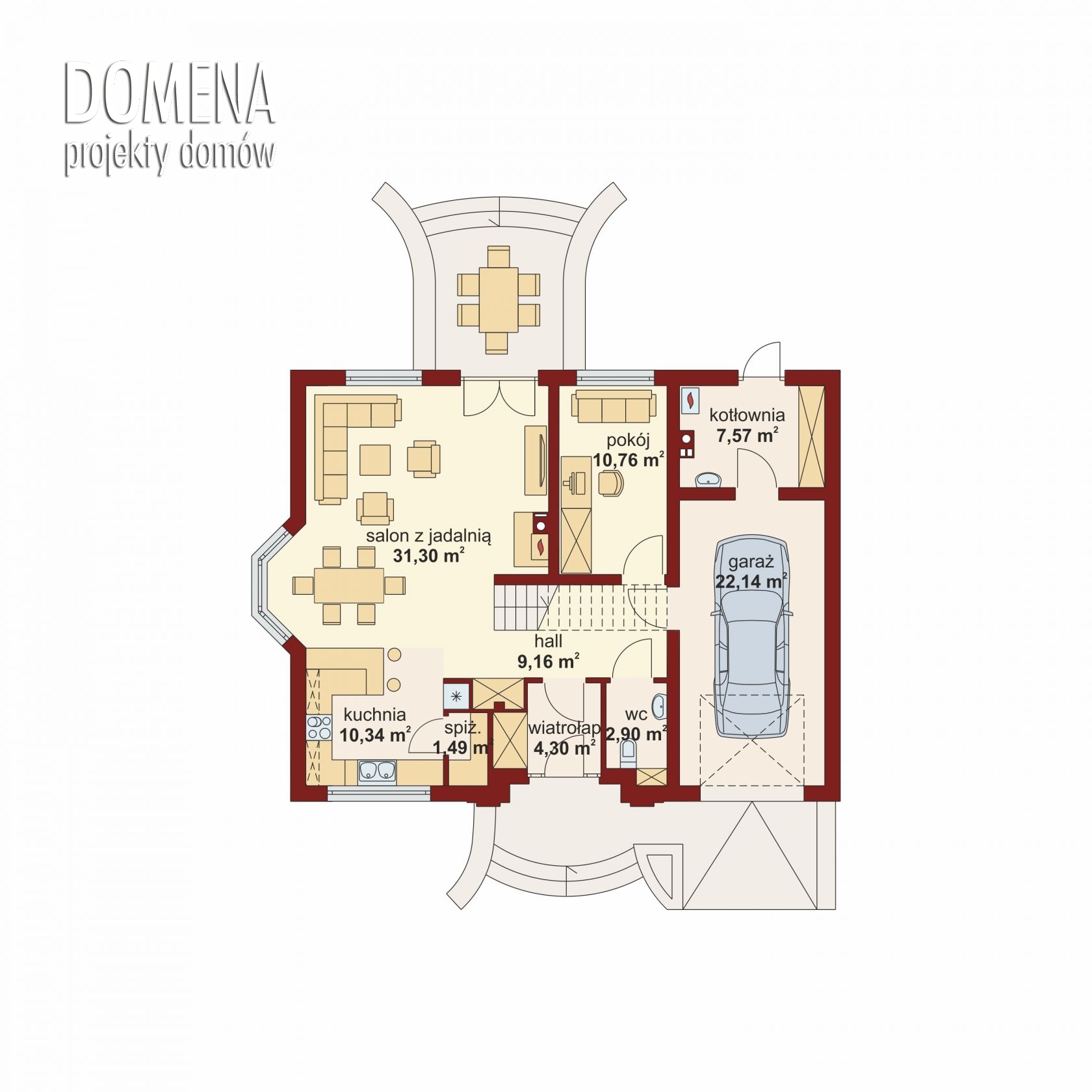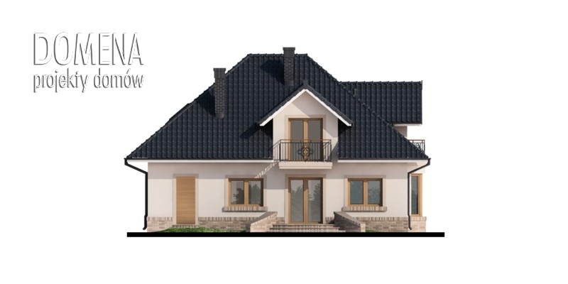 Diogenes to dom z założenia zaprojektowany dla 5/6 – osobowej rodziny. Posiada klasyczną formę oraz prosty, a zarazem funkcjonalny rzut. Umieszczone osiowo wejście posiada praktyczne zadaszenie. Po jego minięciu wkracza się w strefę dzienną budynku. Stanowi ją salon z kominkiem i szerokim widokiem na taras, połączona z nim jadalnia, atrakcyjnie położona w przeszklonym wykuszu, oraz otwarta kuchnia ze spiżarnią. Ta ostatnia może również funkcjonować jako zamknięta po dostawieniu ścianki działowej. Lewą stronę wiatrołapu, gdzie zaprojektowane zostało miejsce na użyteczne szafy wnękowe, lodówkę i spiżarnię możemy przekształcić w jednoprzestrzenne pomieszczenie służące następnie jako pomieszczenie gospodarcze, garderoba, czy duża spiżarnia. W okolicy strefy wejściowej znajduje się także pokój, mogący pełnić funkcję sypialni, gabinetu, czy pokoju gościnnego oraz naprzeciwległa łazienka. Strefa gospodarcza to garaż i kotłownia z przydatnym bezpośrednim wyjściem na część ogrodową. Poddasze w całości stanowi strefa nocna. Na nią składa się duża sypialnia z indywidualną garderobą i łazienką oraz dwie sypialnie z bezpośrednim wyjściem na balkon (jedna z nich także z garderobą).