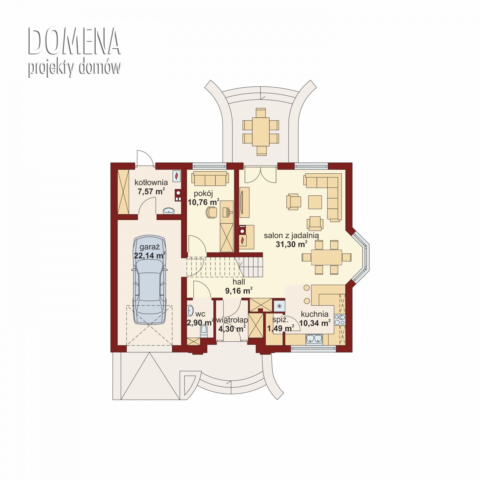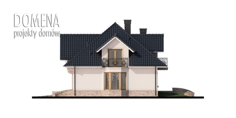 Diogenes to dom z założenia zaprojektowany dla 5/6 – osobowej rodziny. Posiada klasyczną formę oraz prosty, a zarazem funkcjonalny rzut. Umieszczone osiowo wejście posiada praktyczne zadaszenie. Po jego minięciu wkracza się w strefę dzienną budynku. Stanowi ją salon z kominkiem i szerokim widokiem na taras, połączona z nim jadalnia, atrakcyjnie położona w przeszklonym wykuszu, oraz otwarta kuchnia ze spiżarnią. Ta ostatnia może również funkcjonować jako zamknięta po dostawieniu ścianki działowej. Lewą stronę wiatrołapu, gdzie zaprojektowane zostało miejsce na użyteczne szafy wnękowe, lodówkę i spiżarnię możemy przekształcić w jednoprzestrzenne pomieszczenie służące następnie jako pomieszczenie gospodarcze, garderoba, czy duża spiżarnia. W okolicy strefy wejściowej znajduje się także pokój, mogący pełnić funkcję sypialni, gabinetu, czy pokoju gościnnego oraz naprzeciwległa łazienka. Strefa gospodarcza to garaż i kotłownia z przydatnym bezpośrednim wyjściem na część ogrodową. Poddasze w całości stanowi strefa nocna. Na nią składa się duża sypialnia z indywidualną garderobą i łazienką oraz dwie sypialnie z bezpośrednim wyjściem na balkon (jedna z nich także z garderobą).