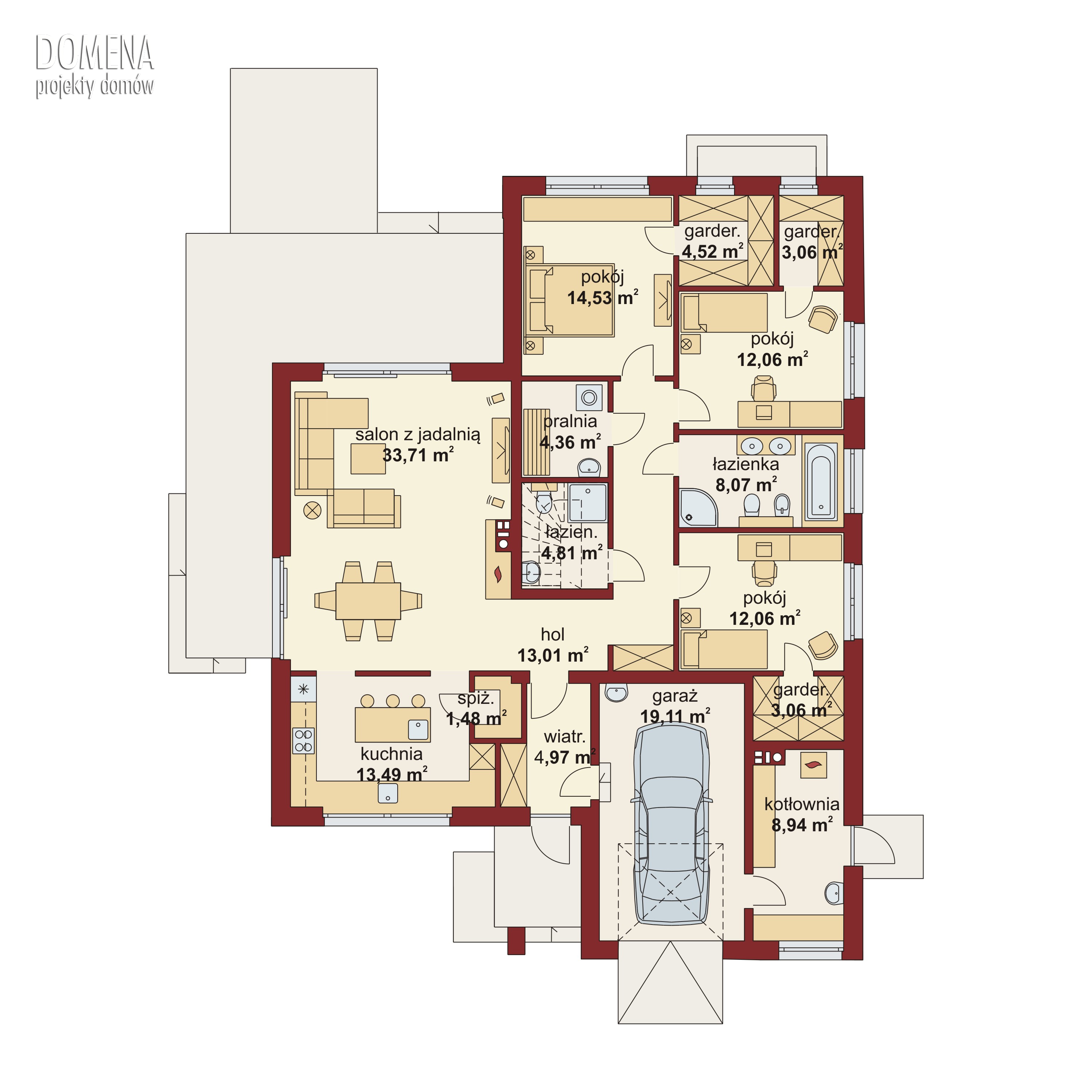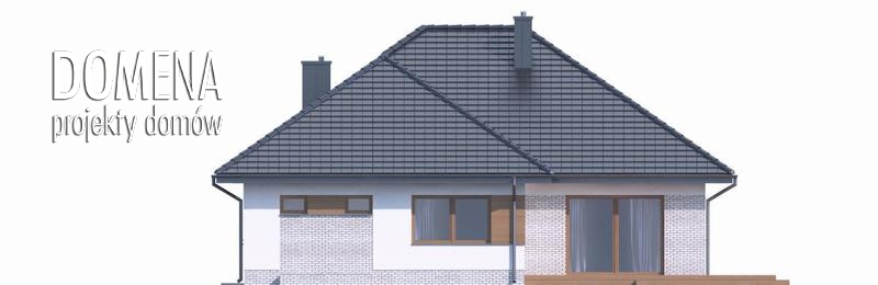 DOMENA 102 A to wygodny dom parterowy, dla 4,5 osób. Nowoczesna architektura, podkreślona dużymi przeszkleniami świetnie wpisuje się w obecne trendy. Po minięciu praktycznego podcienia przed głównym wejściem do domu, przechodząc przez wiatrołap, wkraczamy do strefy dziennej budynku. Stanowi ją otwarta przestrzeń, z której bez trudu wyodrębnić można salon z kominkiem, jadalnię oraz kuchnię. Szczególnie atrakcyjnie kształtuje się ta ostatnia, wyposażona w wygodną wyspę kuchenną i spiżarnię. Kuchnię można prostymi środkami przekształcić, np. rezygnując ze spiżarni dostawić dodatkowy blat kuchenny, powiększając jednocześnie wiatrołap o miejsce dla szaf, czy uzupełniając ściankę działową, z kuchni częściowo otwartej zrobić zamkniętą. W drugiej części domu mieści się strefa nocna. Składają się na nią trzy pokoje, każdy z własną garderobą. Przy jednej z łazienek znajduje się pralnia. Rezygnując z tej łazienki na koszt biegnących na poddasze schodów, po jego adaptacji, możemy zyskać dodatkową przestrzeń mieszkalną. Strefa pomocnicza z kotłownią i garażem dostępna jest bezpośrednio z wiatrołapu.