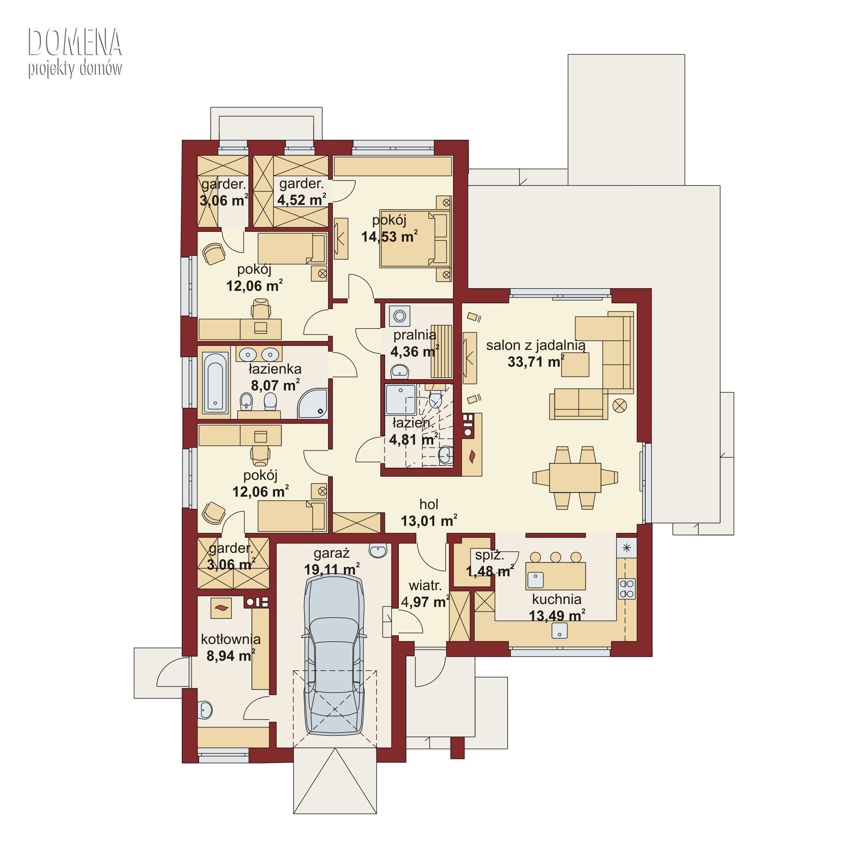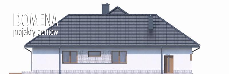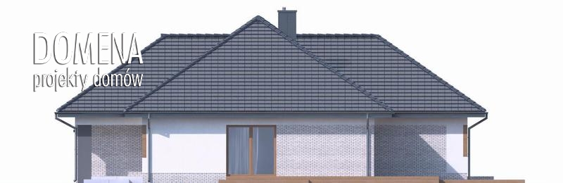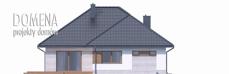 DOMENA 102 A to wygodny dom parterowy, dla 4,5 osób. Nowoczesna architektura, podkreślona dużymi przeszkleniami świetnie wpisuje się w obecne trendy. Po minięciu praktycznego podcienia przed głównym wejściem do domu, przechodząc przez wiatrołap, wkraczamy do strefy dziennej budynku. Stanowi ją otwarta przestrzeń, z której bez trudu wyodrębnić można salon z kominkiem, jadalnię oraz kuchnię. Szczególnie atrakcyjnie kształtuje się ta ostatnia, wyposażona w wygodną wyspę kuchenną i spiżarnię. Kuchnię można prostymi środkami przekształcić, np. rezygnując ze spiżarni dostawić dodatkowy blat kuchenny, powiększając jednocześnie wiatrołap o miejsce dla szaf, czy uzupełniając ściankę działową, z kuchni częściowo otwartej zrobić zamkniętą. W drugiej części domu mieści się strefa nocna. Składają się na nią trzy pokoje, każdy z własną garderobą. Przy jednej z łazienek znajduje się pralnia. Rezygnując z tej łazienki na koszt biegnących na poddasze schodów, po jego adaptacji, możemy zyskać dodatkową przestrzeń mieszkalną. Strefa pomocnicza z kotłownią i garażem dostępna jest bezpośrednio z wiatrołapu.