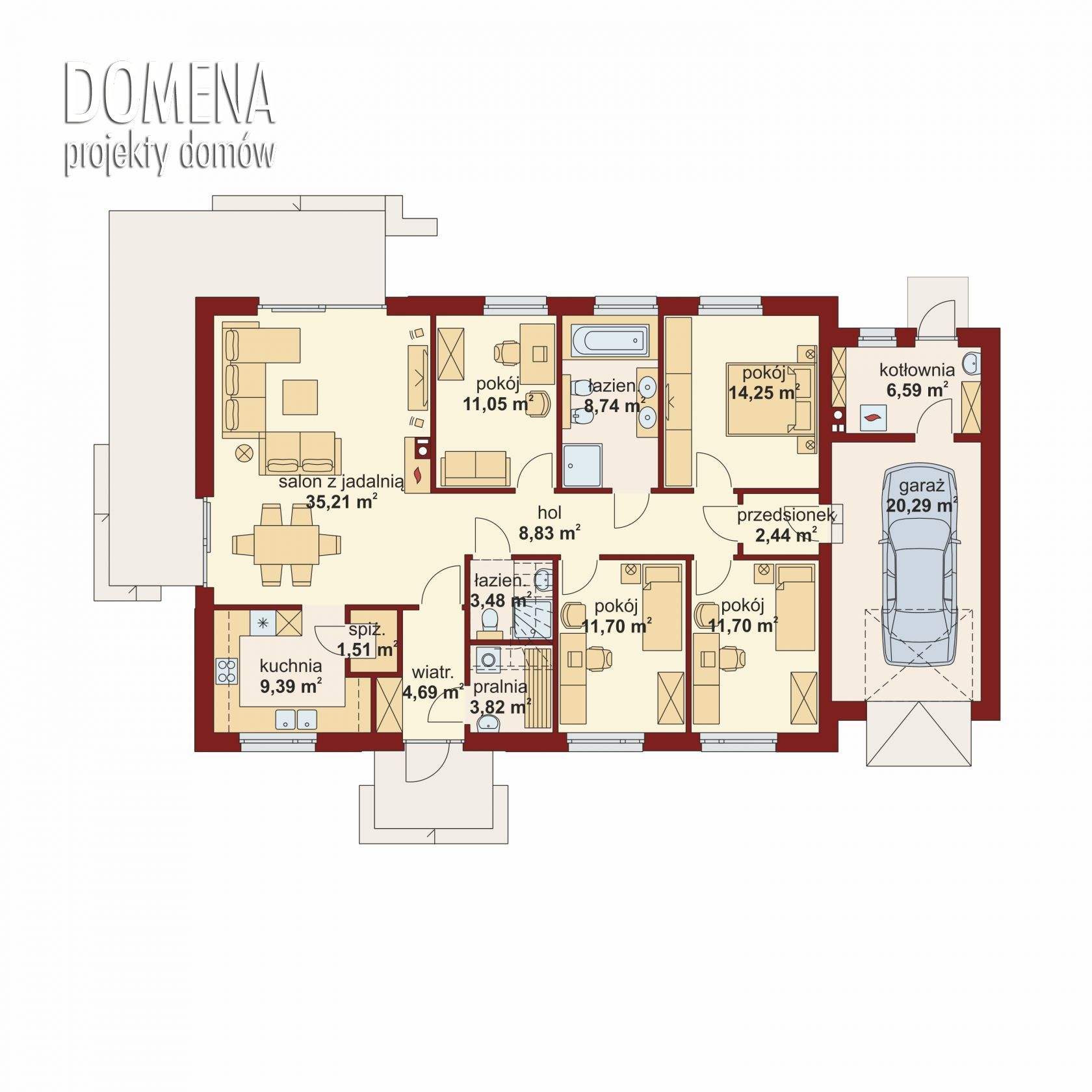 Przedsionek z miejscem na szafę otwiera się na strefę dzienną, składającą się z przestronnego salonu połączonego z jadalnią, usytuowanych obok wydzielonej kuchni ze spiżarnią (kuchnię można także z łatwością zamienić w połączony z jadalnią aneks). Z funkcjonalnego holu mamy dostęp do dwóch łazienek oraz czterech pokoi (jeden z obszerną garderobą). Pomieszczenie gospodarcze, z miejscem na piec gazowy i pralkę, dostępne z wiatrołapu.