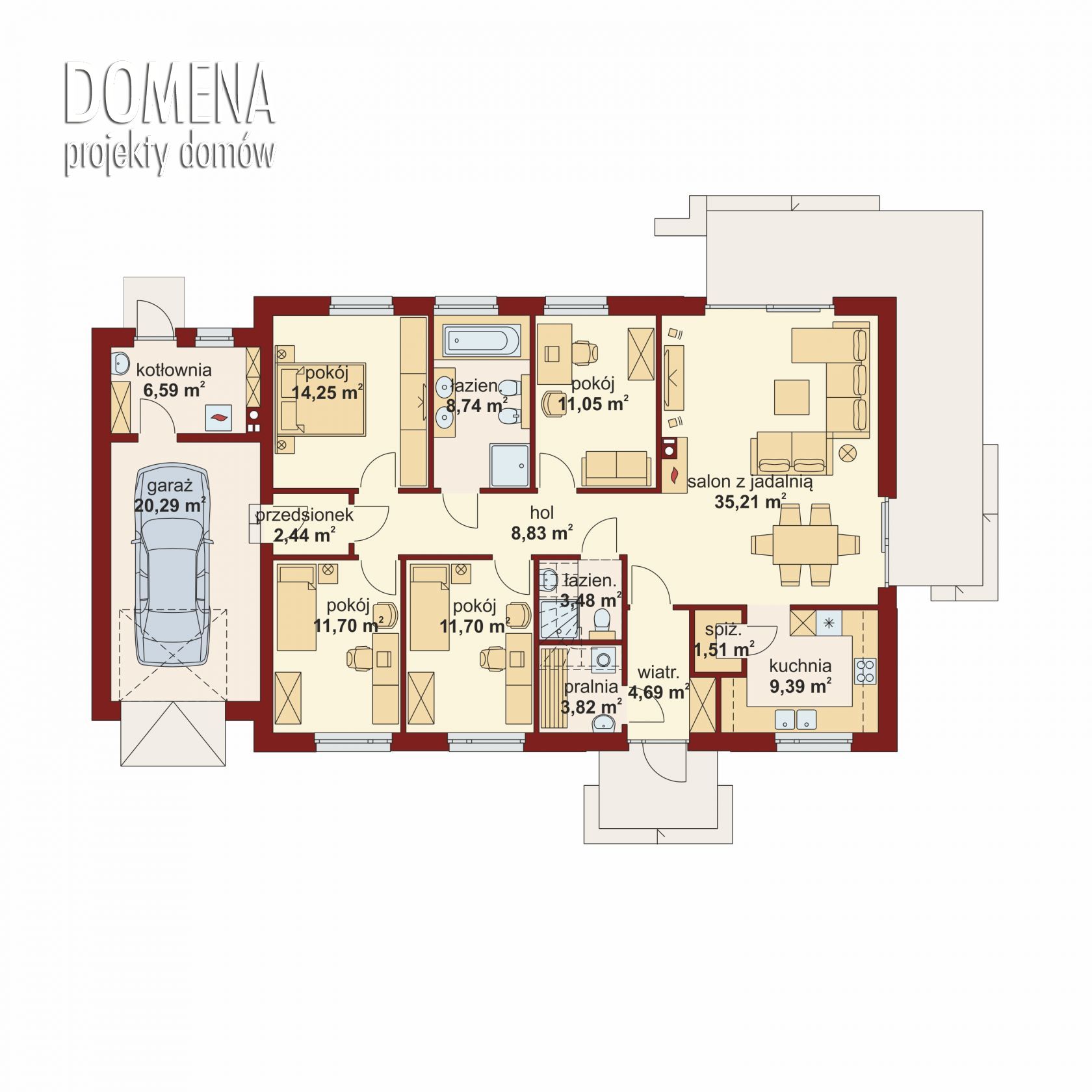 Przedsionek z miejscem na szafę otwiera się na strefę dzienną, składającą się z przestronnego salonu połączonego z jadalnią, usytuowanych obok wydzielonej kuchni ze spiżarnią (kuchnię można także z łatwością zamienić w połączony z jadalnią aneks). Z funkcjonalnego holu mamy dostęp do dwóch łazienek oraz czterech pokoi (jeden z obszerną garderobą). Pomieszczenie gospodarcze, z miejscem na piec gazowy i pralkę, dostępne z wiatrołapu.