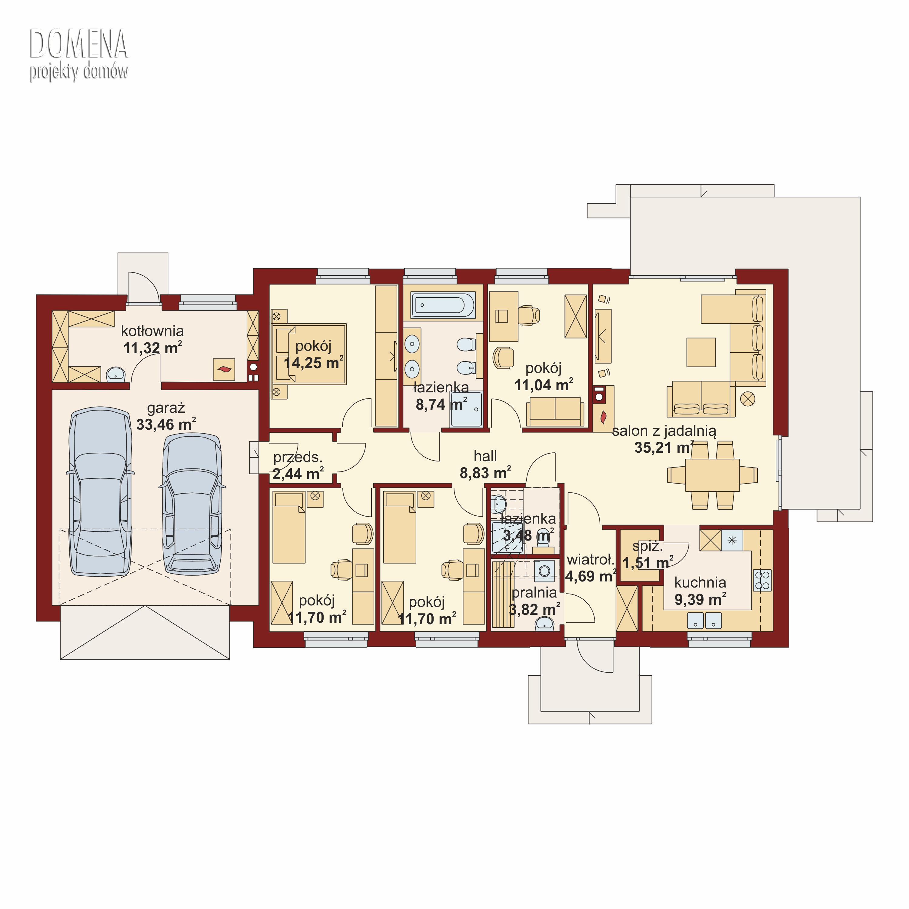 Przedsionek z miejscem na szafę otwiera się na strefę dzienną, składającą się z przestronnego salonu połączonego z jadalnią, usytuowanych obok wydzielonej kuchni ze spiżarnią (kuchnię można także z łatwością zamienić w połączony z jadalnią aneks). Z funkcjonalnego holu mamy dostęp do dwóch łazienek oraz czterech pokoi . Pomieszczenie gospodarcze, z miejscem na piec gazowy i pralkę, dostępne z wiatrołapu.