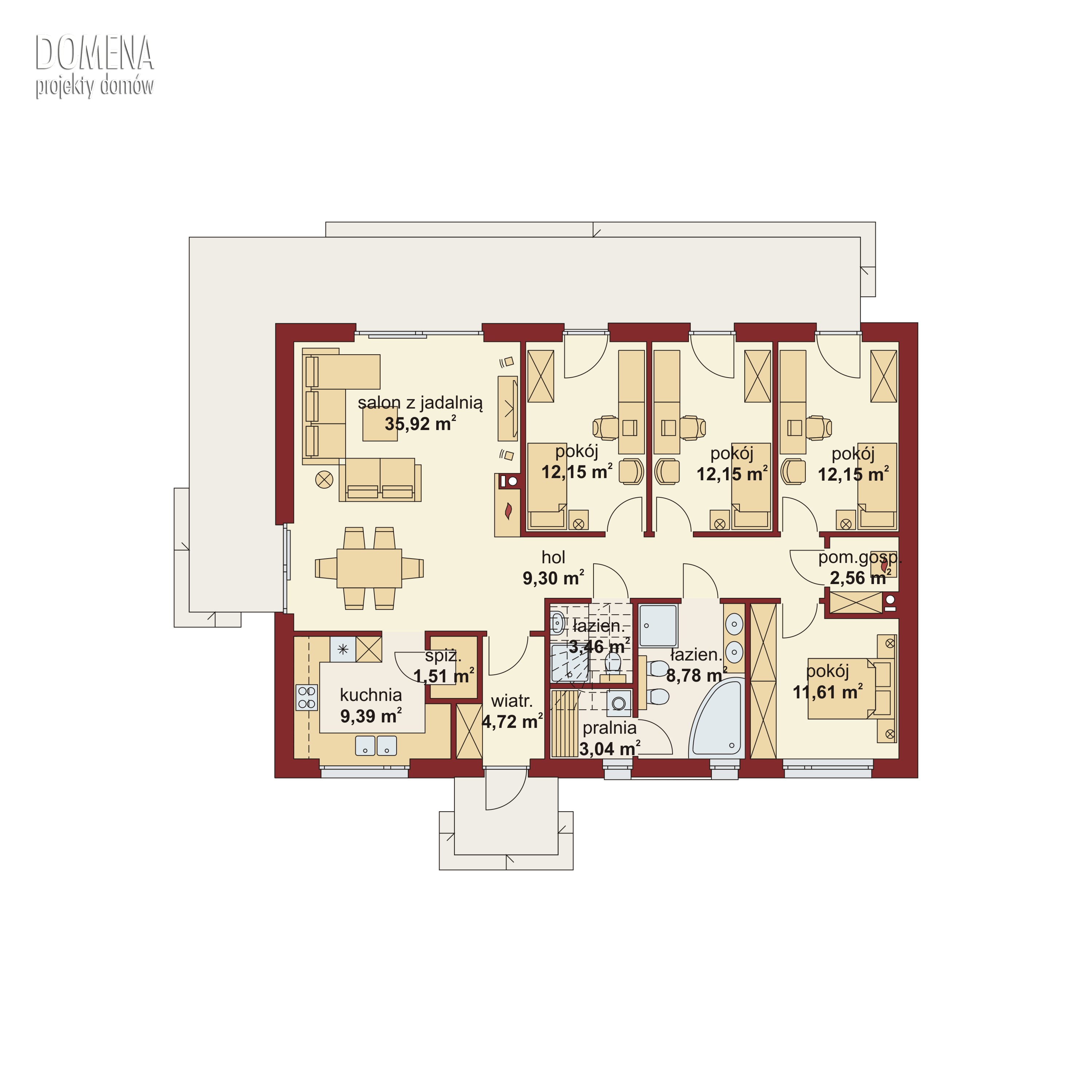 Przedsionek z miejscem na szafę otwiera się na strefę dzienną, składającą się z przestronnego salonu połączonego z jadalnią oraz, łatwą do wydzielenia, kuchnią ze spiżarnią. Z funkcjonalnego holu mamy dostęp do dwóch łazienek oraz czterech pokoi. Jednostanowiskowy garaż dostępny z holu, z garażu dostępna kotłownia z wyjściem na ogród.