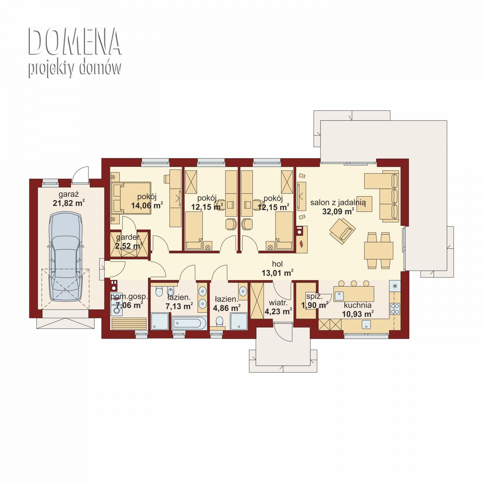 Przedsionek z miejscem na szafę prowadzi do strefy dziennej oraz części gospodarczej. Strefa dzienna składa się z przestronnego salonu połączonego z jadalnią oraz kuchnią ze spiżarnią (którą można z łatwością oddzielić). Z holu mamy dostęp do strefy 3 sypialni, z czego jednej z garderobą, łazienki i WC. Część gospodarcza składa się z kotłowni oraz jednostanowiskowego garażu.