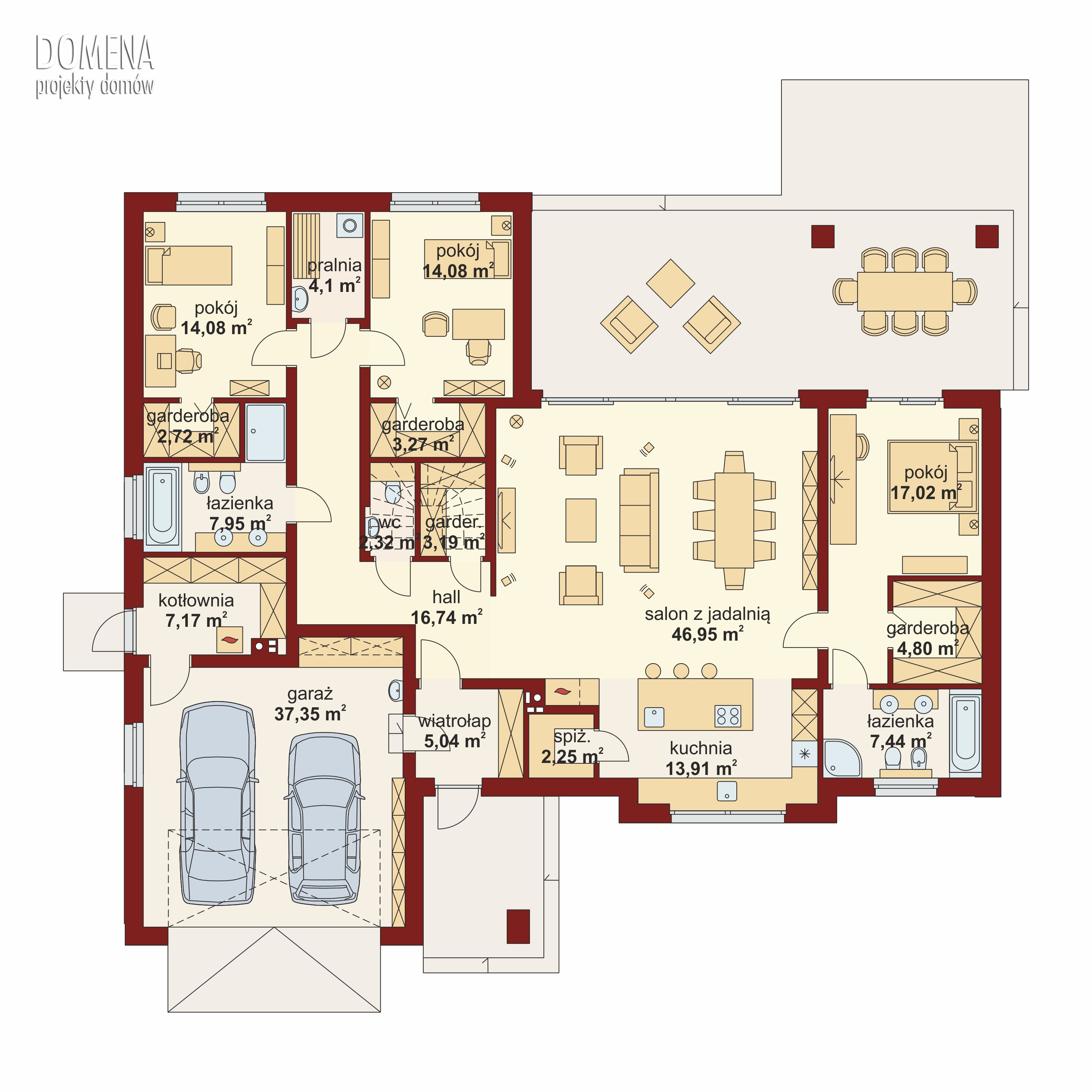 Dom zachwyca reprezentacyjnym salonem z jadalnią i otwartą kuchnią ze spiżarnią, którą można w razie potrzeby wydzielić jako osobne pomieszczenie. Ekskluzywnym rozwiązaniem jest intymna strefa głównej sypialni z własną łazienką i garderobą oraz bezpośrednim dostępem do części dziennej i zadaszonego tarasu. Przy przejściu do zacisznej części nocnej znajduje się toaleta i podręczna garderoba, za którymi znajdują się dwie sypialnie z własnymi garderobami oraz ogólnodostępna łazienka. Układ funkcjonalny dopełnia duży, dwustanowiskowy garaż z przejściem do obszernego pomieszczenia gospodarczego z praktycznym wyjściem do ogrodu.
