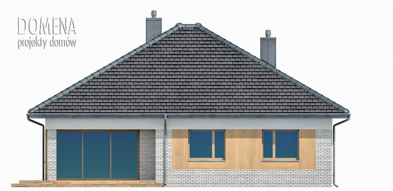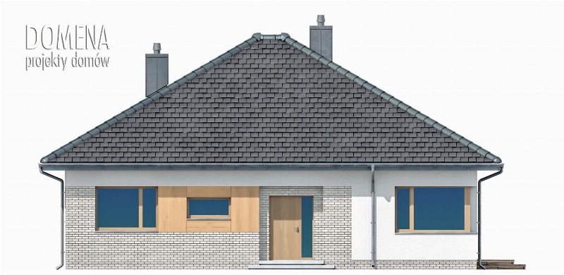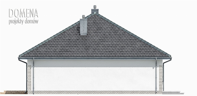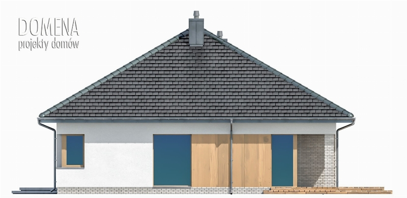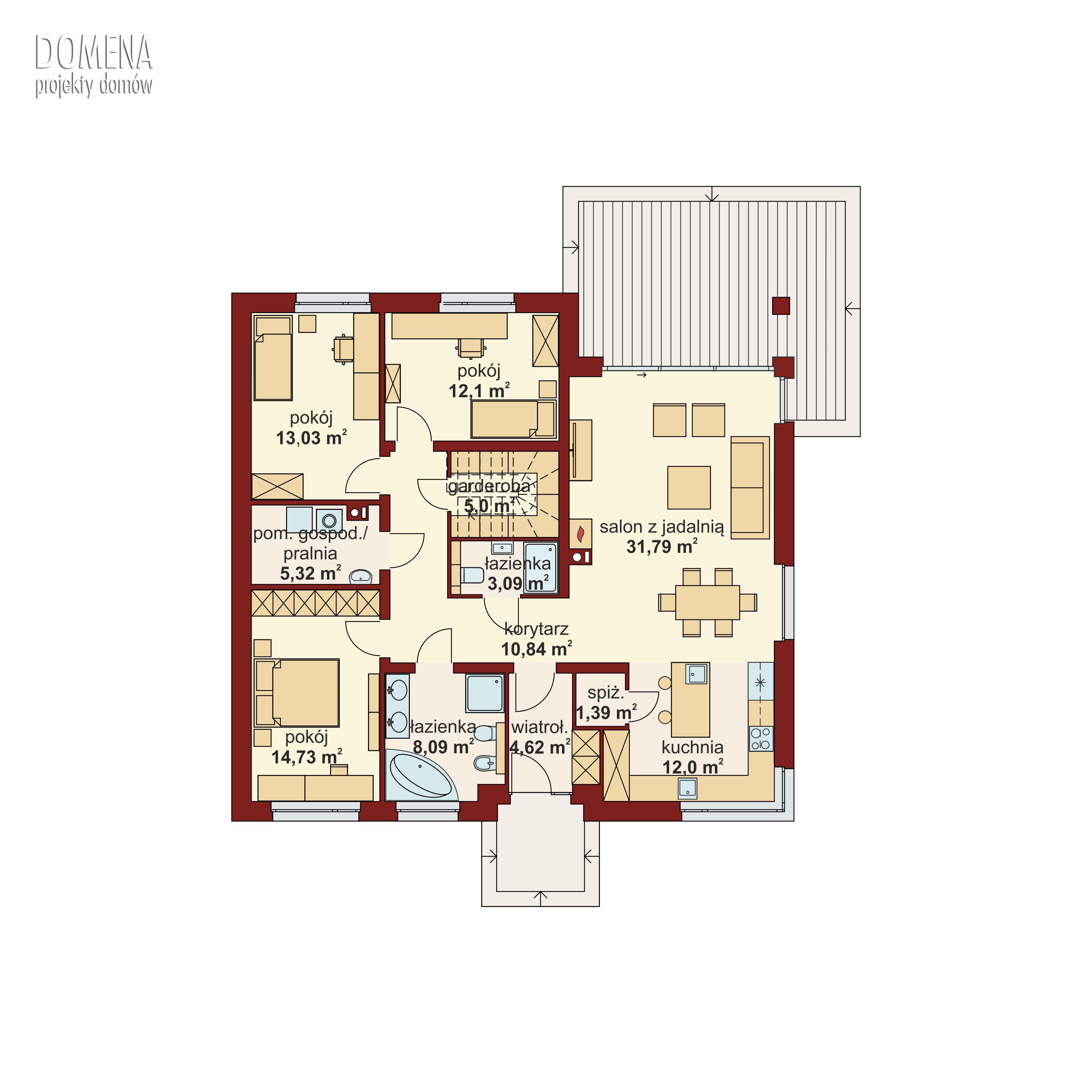 DOMENA 112 C1 to dom dla czteroosobowej rodziny. Przedsionek z miejscem na szafę otwiera się na strefę dzienną, składającą się z przestronnego salonu połączonego z jadalnią oraz kuchnią ze spiżarnią. Z funkcjonalnego holu mamy dostęp do sypialni, dwóch pokoi oraz dwóch łazienek. W tej części znajduje się także pomieszczenie gospodarcze pełniące funkcję pralni z miejscem na piec gazowy oraz ogólnodostępna garderoba. Chcąc wykorzystać, po adaptacji, strych, najlepiej umieścić schody w jej miejscu.