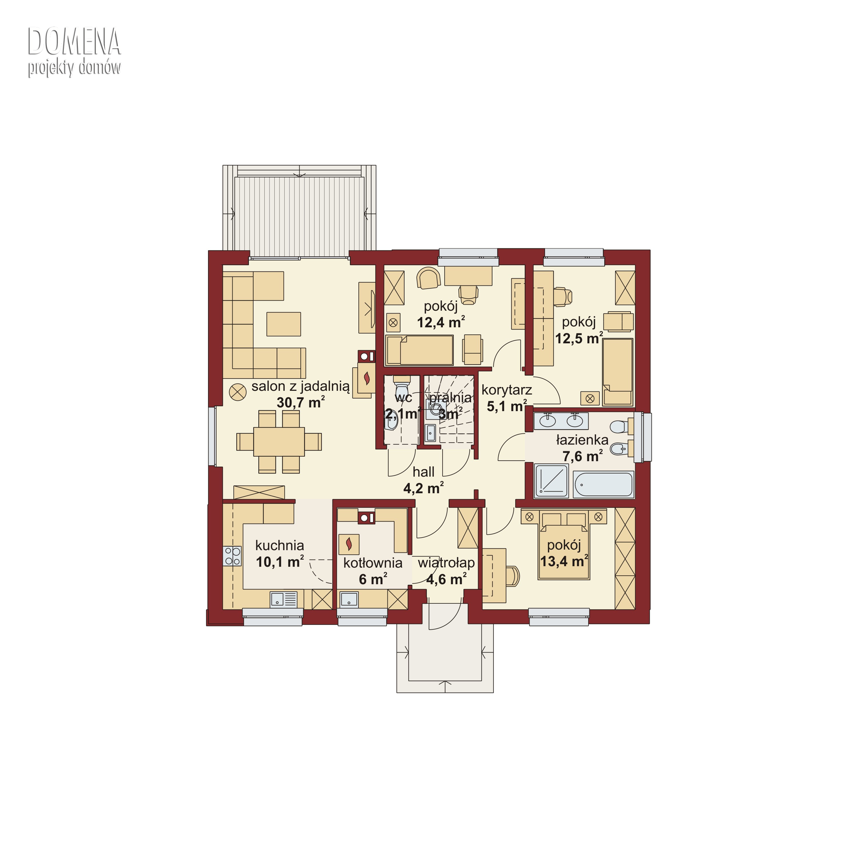 Domena 112 jest wygodnym projektem domu dla 4 osobowej rodziny. Jego ergonomiczny kształt pozwoli zaoszczędzić na kosztach budowy, a w dalszej perspektywie na ogrzewaniu zimą. Z wiatrołapu można przejść bezpośrednio do kotłowni, z której z kolei można zrobić, w ramach adaptacji, przejście do kuchni. W przypadku adaptacji strychu na pomieszczenia użytkowe, co ułatwia zastosowanie Terivy do budowy stropu, schody proponujemy umiejscowić zamiast pomieszczenia WC. Przy czym proponowane rozmieszczenie i wysokość ich stopni pozwoli na zachowanie pralni. Przestrzeń strychu można wtedy podzielić na dwa wygodne pokoje i łazienkę.