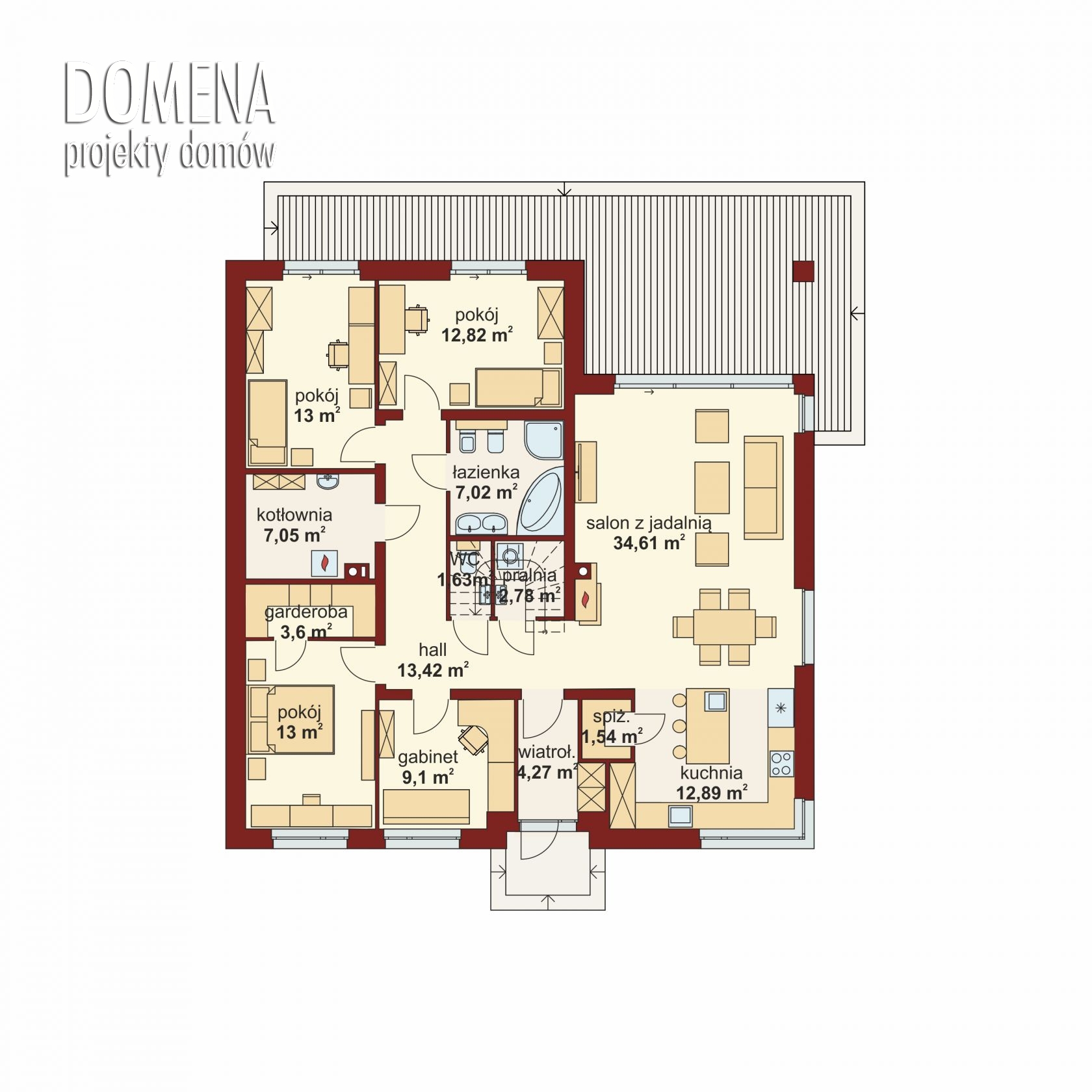 Nie mamy w planie wnętrz do projektu Domena 121 C1. Proszę spojrzeć na projekt Domena 121 A, który ma podobny układ salonu - tylko więcej przeszkleń.
