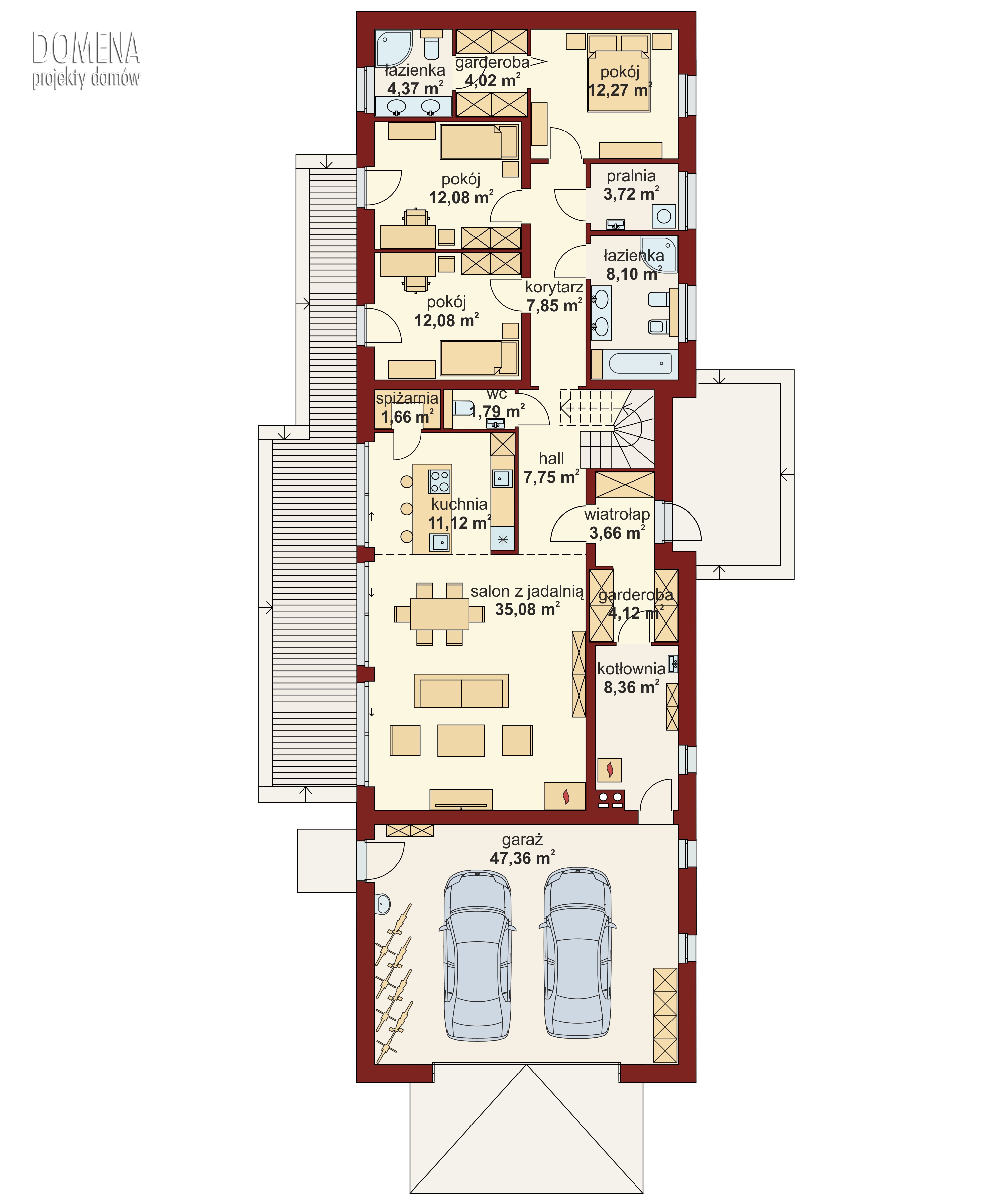 Przedsionek z miejscem na szafę otwiera się na strefę dzienną, składającą się z przestronnego salonu połączonego z jadalnią oraz, łatwą do wydzielenia, kuchnią ze spiżarnią. Z korytarza mamy dostęp do dwóch pokoi, łazienki, pralni oraz sypialni małżeńskiej, do której znów przylegają garderoba i kolejna łazienka. Schody prowadzą na antresolę, z której jest dostęp do strychu. Duży, dwustanowiskowy garaż miesci się za kotłownią, do której wchodziny przez garderobe przy wiatrołapie.