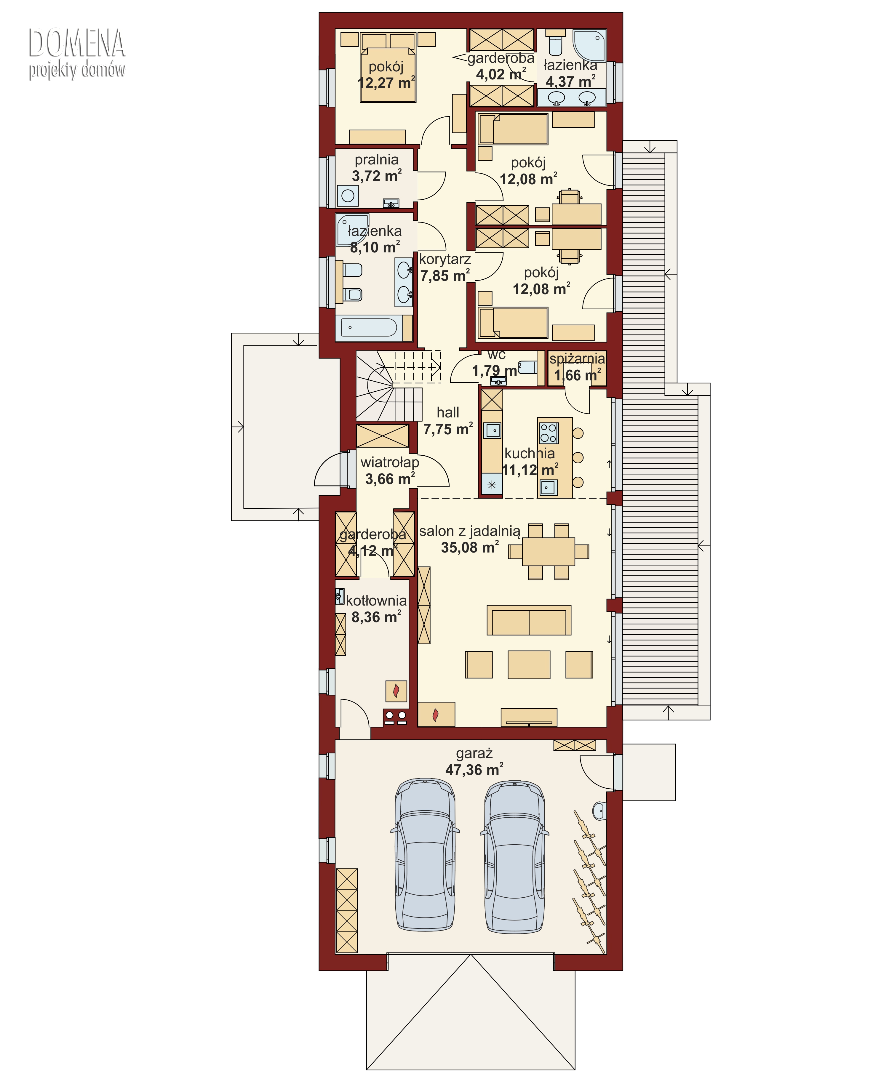 Przedsionek z miejscem na szafę otwiera się na strefę dzienną, składającą się z przestronnego salonu połączonego z jadalnią oraz, łatwą do wydzielenia, kuchnią ze spiżarnią. Z korytarza mamy dostęp do dwóch pokoi, łazienki, pralni oraz sypialni małżeńskiej, do której znów przylegają garderoba i kolejna łazienka. Schody prowadzą na antresolę, z której jest dostęp do strychu. Duży, dwustanowiskowy garaż miesci się za kotłownią, do której wchodziny przez garderobe przy wiatrołapie.