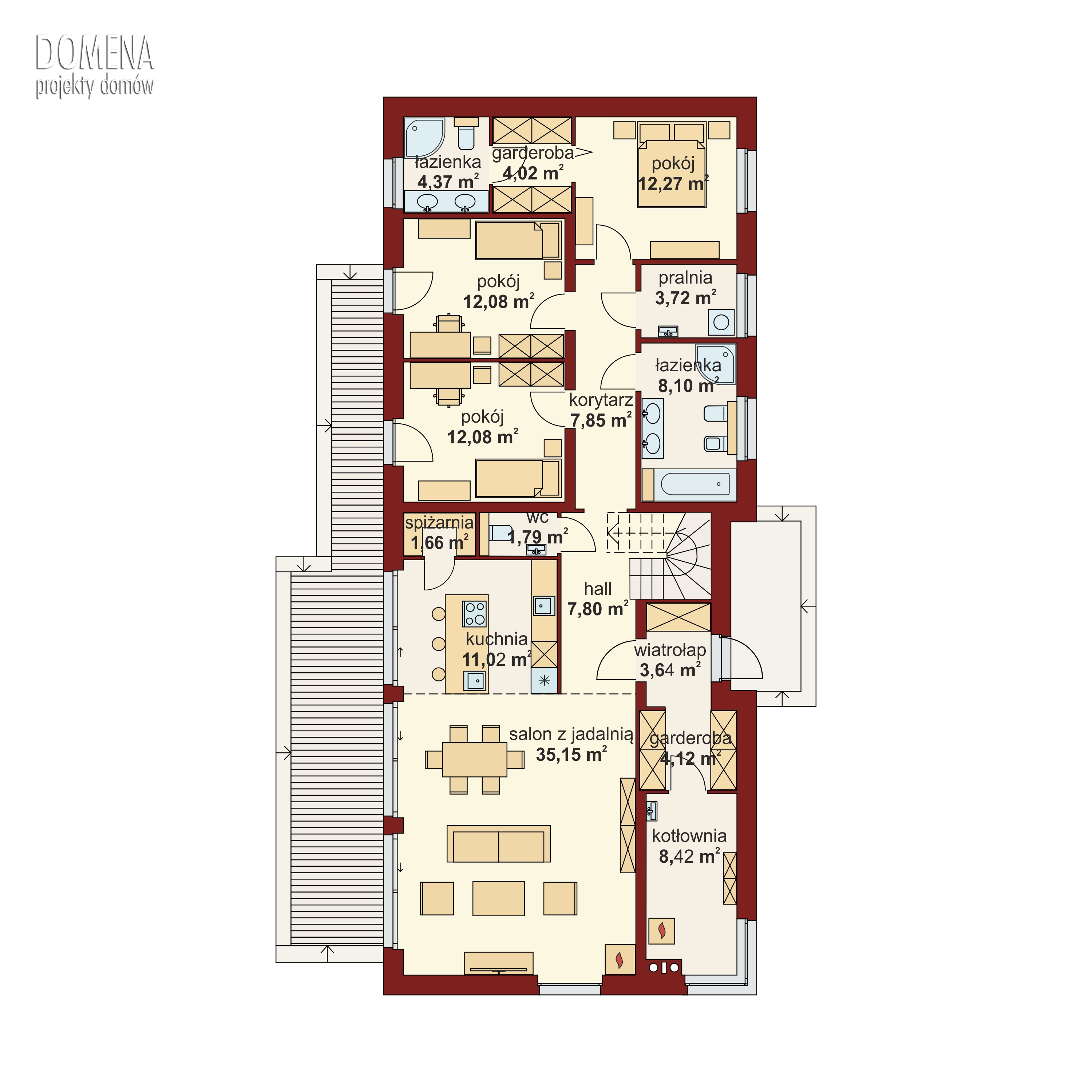 Przedsionek z miejscem na szafę otwiera się na strefę dzienną, składającą się z przestronnego salonu połączonego z jadalnią oraz, łatwą do wydzielenia, kuchnią ze spiżarnią. Z korytarza mamy dostęp do dwóch pokoi, łazienki, pralni oraz sypialni małżeńskiej, do której znów przylegają garderoba i kolejna łazienka. Schody prowadzą na antresolę, z której jest dostęp do strychu.