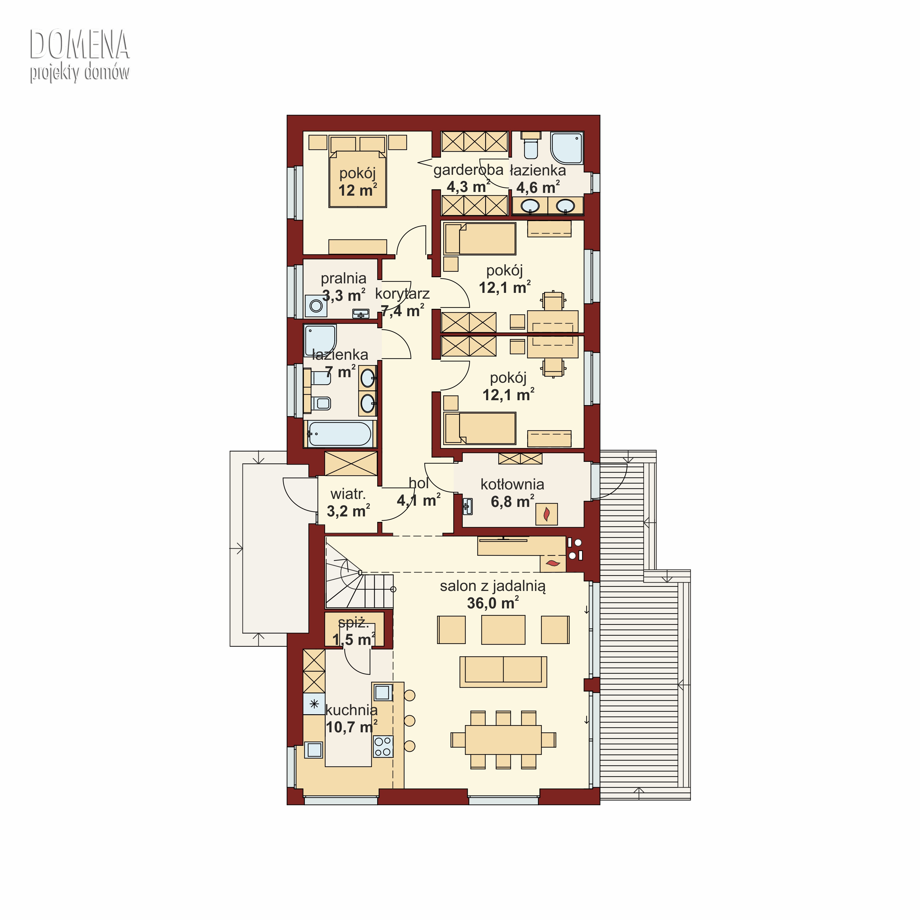 Przedsionek z miejscem na szafę otwiera się na strefę dzienną, składającą się z przestronnego salonu połączonego z jadalnią oraz, łatwą do wydzielenia, kuchnią ze spiżarnią. Z korytarza mamy dostęp do dwóch pokoi, łazienki, pralni oraz sypialni małżeńskiej, do której znów przylegają garderoba i kolejna łazienka. Schody prowadzą na antresolę, z której jest dostęp do strychu.