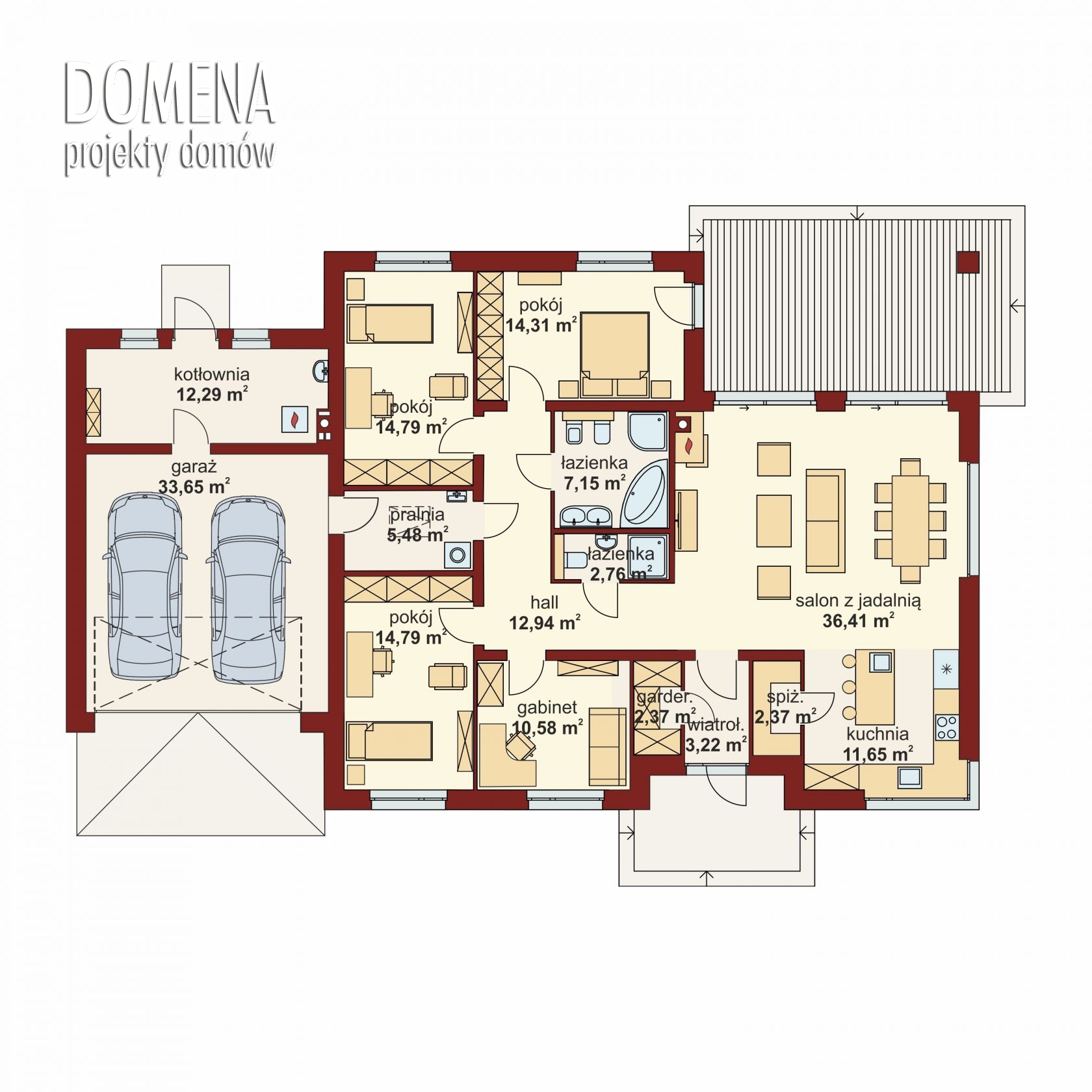 Przedsionek z miejscem na szafę otwiera się na strefę dzienną, składającą się z przestronnego salonu połączonego z jadalnią oraz kuchnią ze spiżarnią. Z funkcjonalnego holu mamy dostęp do strefy prywatnej - trzech sypialni i gabinetu oraz gospodarczej, na którą składają się łazienka, WC, pralnia oraz kotłownia i garaż.