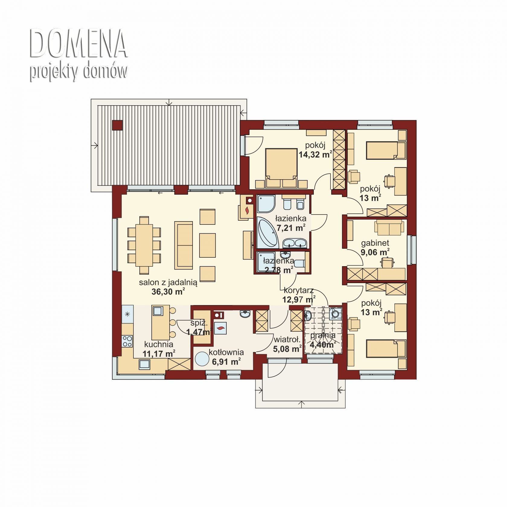 Przedsionek z miejscem na szafę otwiera się na strefę dzienną, składającą się z przestronnego salonu połączonego z jadalnią oraz kuchnią ze spiżarnią. Z funkcjonalnego holu mamy dostęp do strefy prywatnej - trzech sypialni (jedna z garderobą) i gabinetu oraz gospodarczej, na którą składają się łazienka, WC, pralnia oraz kotłownia.