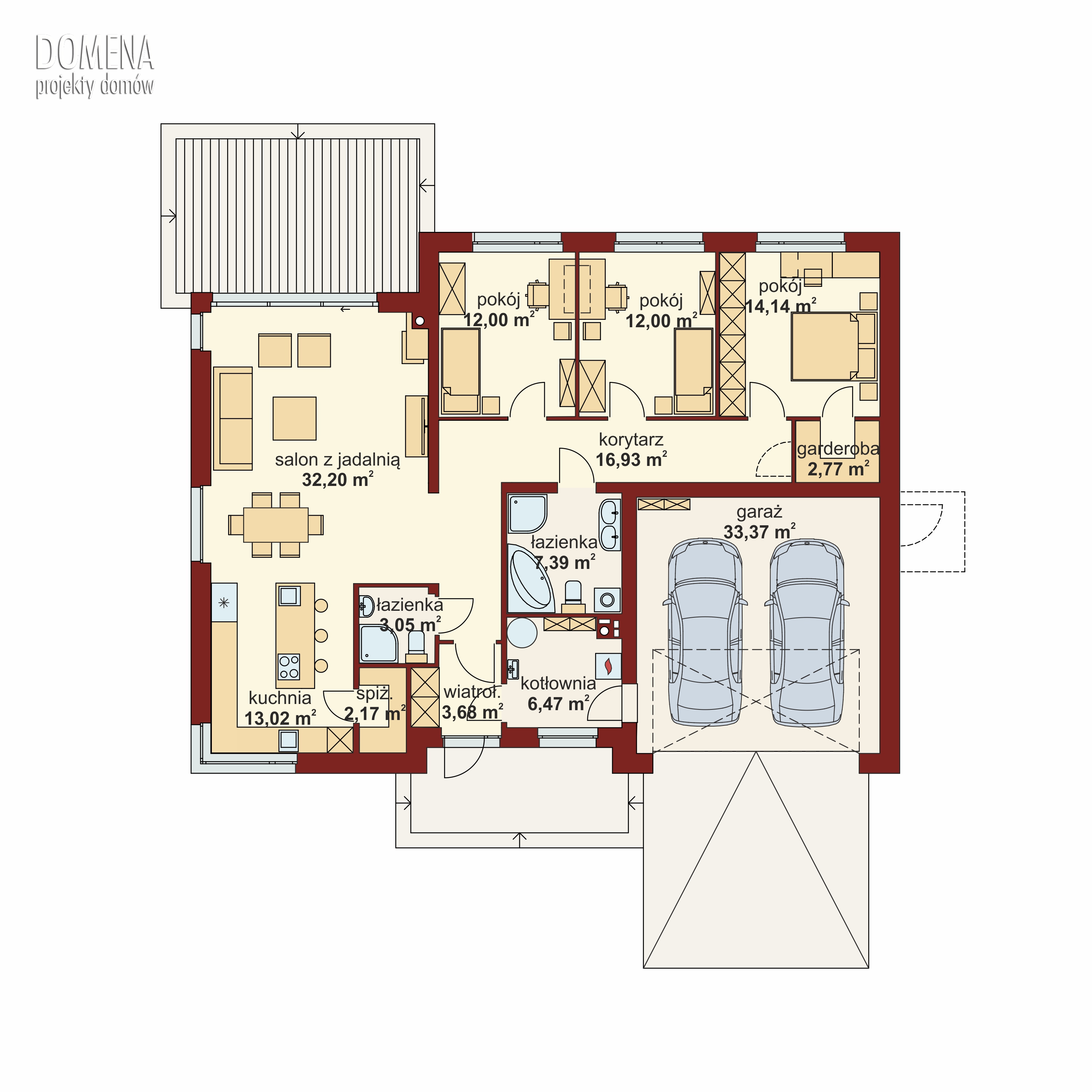 Przedsionek z miejscem na szafę otwiera się na strefę dzienną, składającą się z przestronnego salonu połączonego z jadalnią oraz kuchnią ze spiżarnią. Z funkcjonalnego korytarza mamy dostęp do strefy prywatnej - trzech sypialni (jedna z garderobą) oraz gospodarczej, na którą składają się łazienka, kotłownia oraz wygodny garaż.