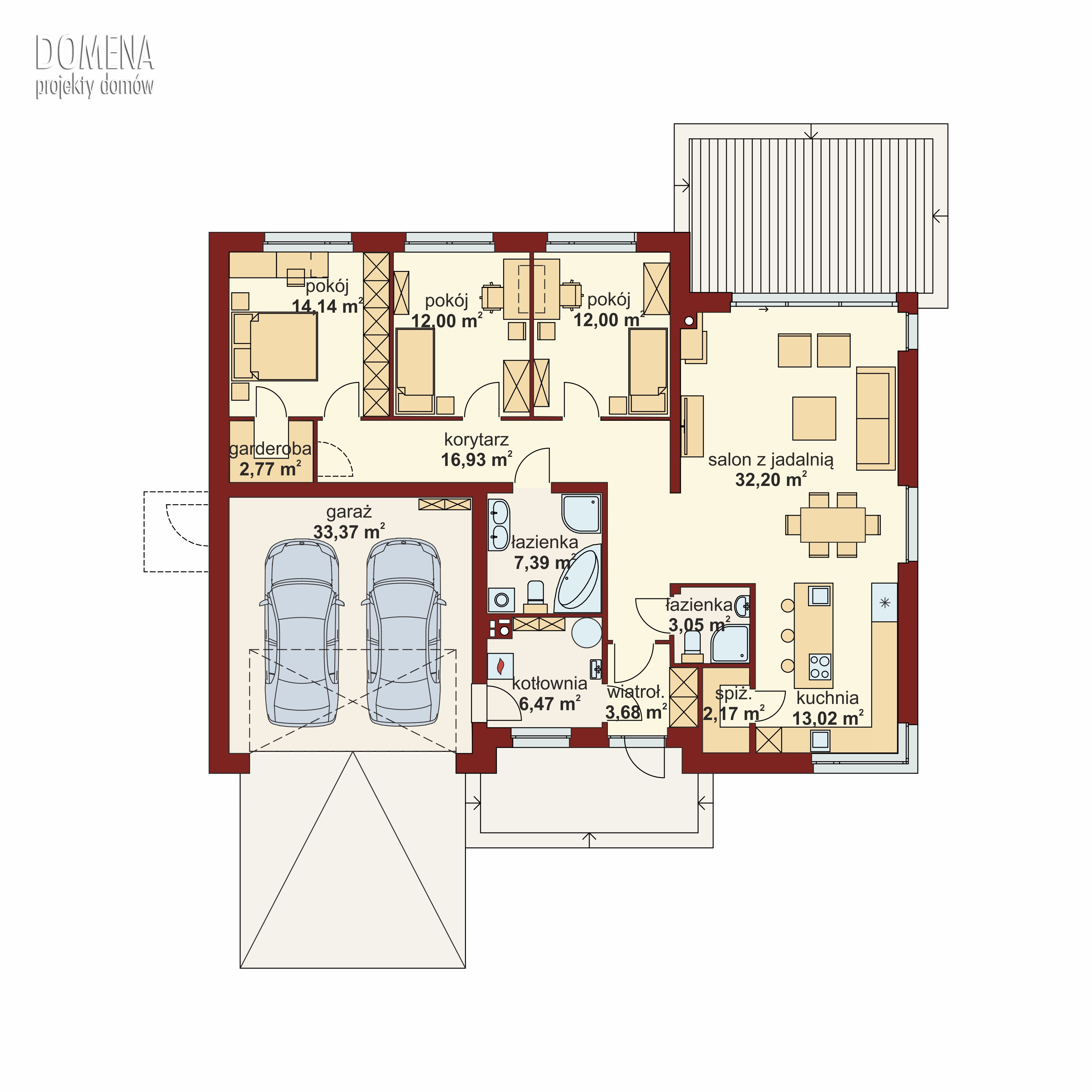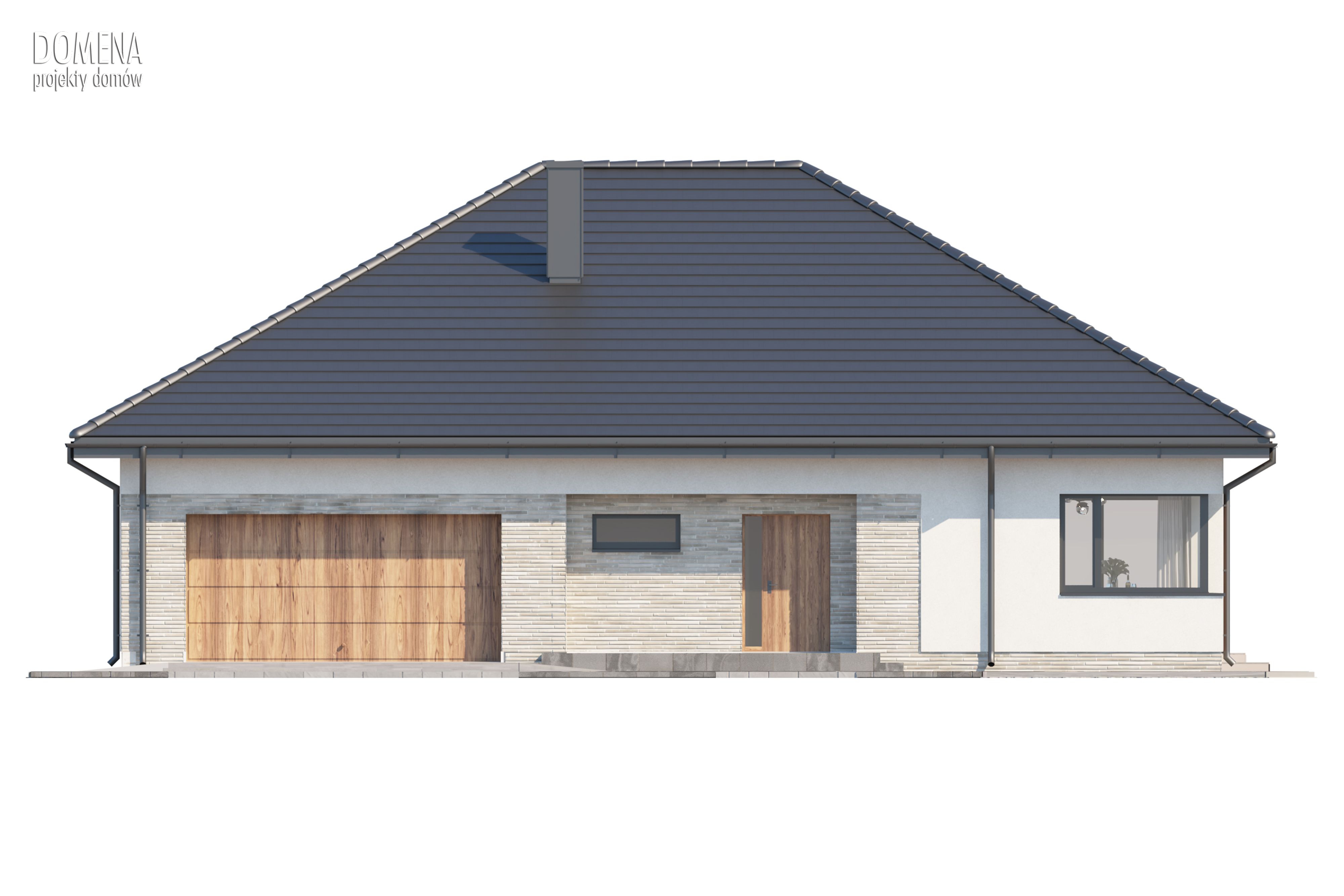 Przedsionek z miejscem na szafę otwiera się na strefę dzienną, składającą się z przestronnego salonu połączonego z jadalnią oraz kuchnią ze spiżarnią. Z funkcjonalnego korytarza mamy dostęp do strefy prywatnej - trzech sypialni (jedna z garderobą) oraz gospodarczej, na którą składają się łazienka, kotłownia oraz wygodny garaż.