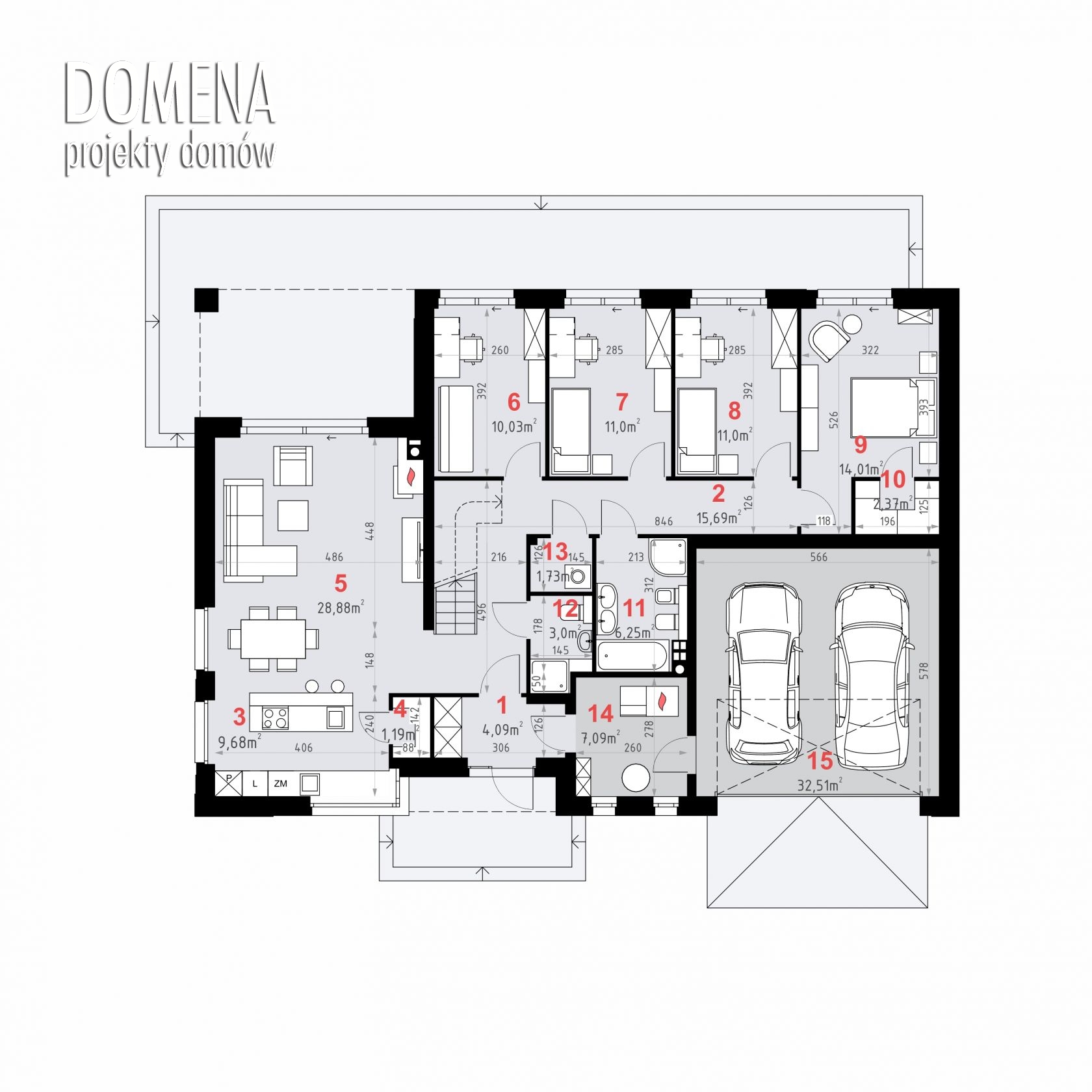 DOMENA 145 B2 to zmniejszona wersja projektu DOMENA 145 B ORAZ DOMENA 145 B1 przedsionek z miejscem na szafę otwiera się na strefę dzienną, składającą się z przestronnego salonu połączonego z jadalnią oraz kuchni ze spiżarnią. Z korytarza mamy dostęp do strefy prywatnej - czterech sypialni ( jednej z garderobą) i dwóch łazienek . Plan domu uzupełnia pom. gosp i kotłownia.