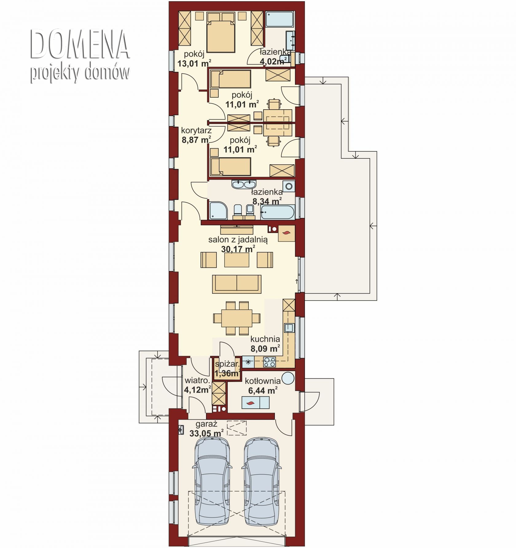 Przedsionek z miejscem na szafę otwiera się na strefę dzienną, składającą się z przestronnego salonu połączonego z jadalnią i kuchnią ze spiżarnią. Z korytarza mamy dostęp do dwóch pokoi, łazienki oraz sypialni małżeńskiej, do której przylega kolejna łazienka. Duży, dwustanowiskowy garaż oraz kotłownia znajdują się za wiatrołapem.