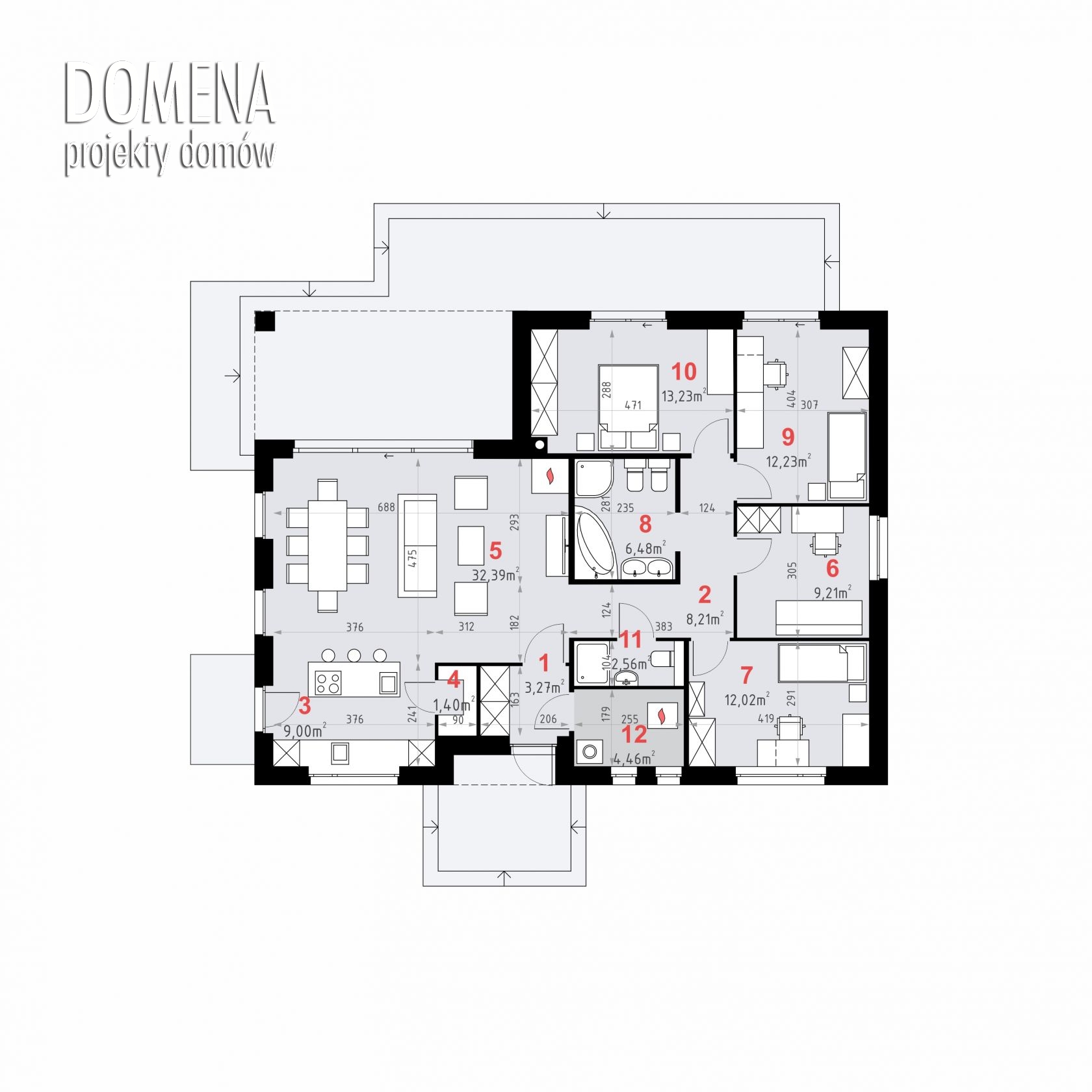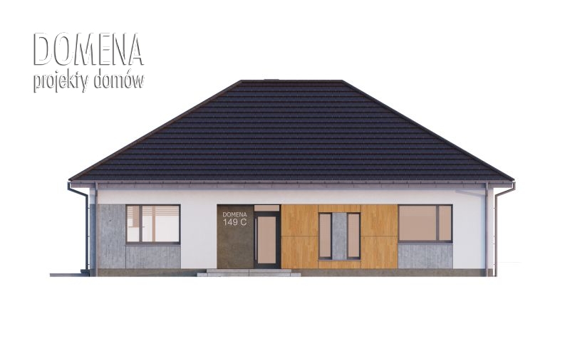 DOMENA 149 C, wiatrołap z miejscem na szafę otwiera się na strefę dzienną, składającą się z przestronnego salonu połączonego z jadalnią oraz kuchni ze spiżarnią. Z korytarza mamy dostęp do strefy prywatnej - trzech sypialni, gabinetu, WC i łazienki. Wejście do pomieszczenia gospodarczego znajduje się w wiatrołapie.