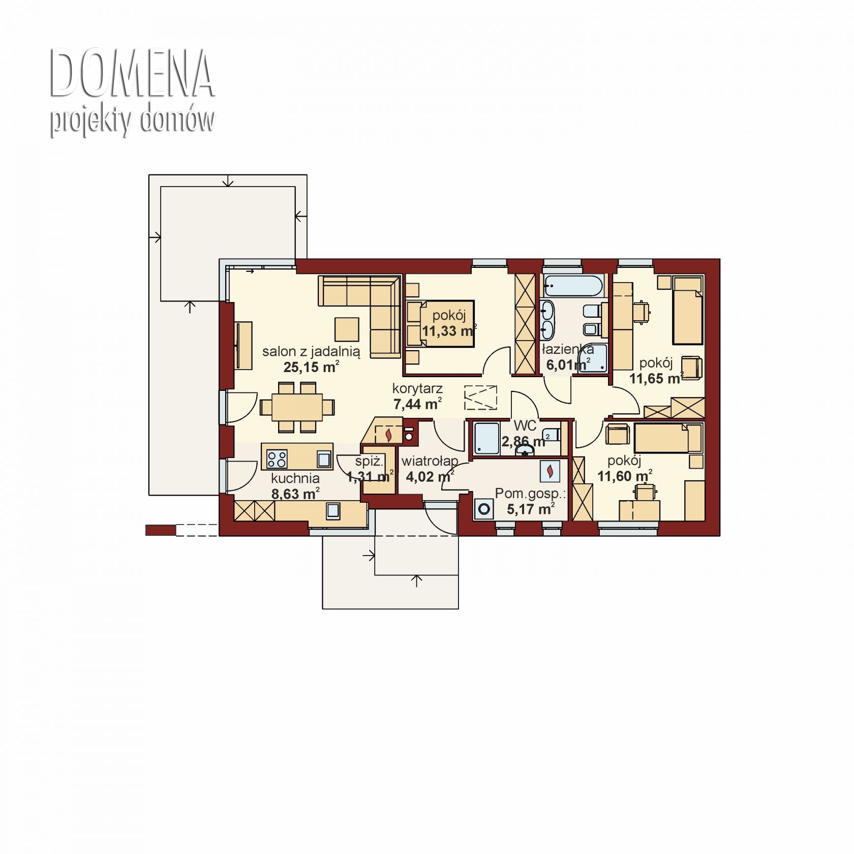 Przedsionek z miejscem na szafę otwiera się na strefę dzienną, składającą się z salonu połączonego z jadalnią oraz kuchni ze spiżarnią. Z korytarza mamy dostęp do strefy prywatnej - trzech sypialni, łazienki i WC. Plan domu uzupełnia pom. gosp z wejściem z wiatrołapu.