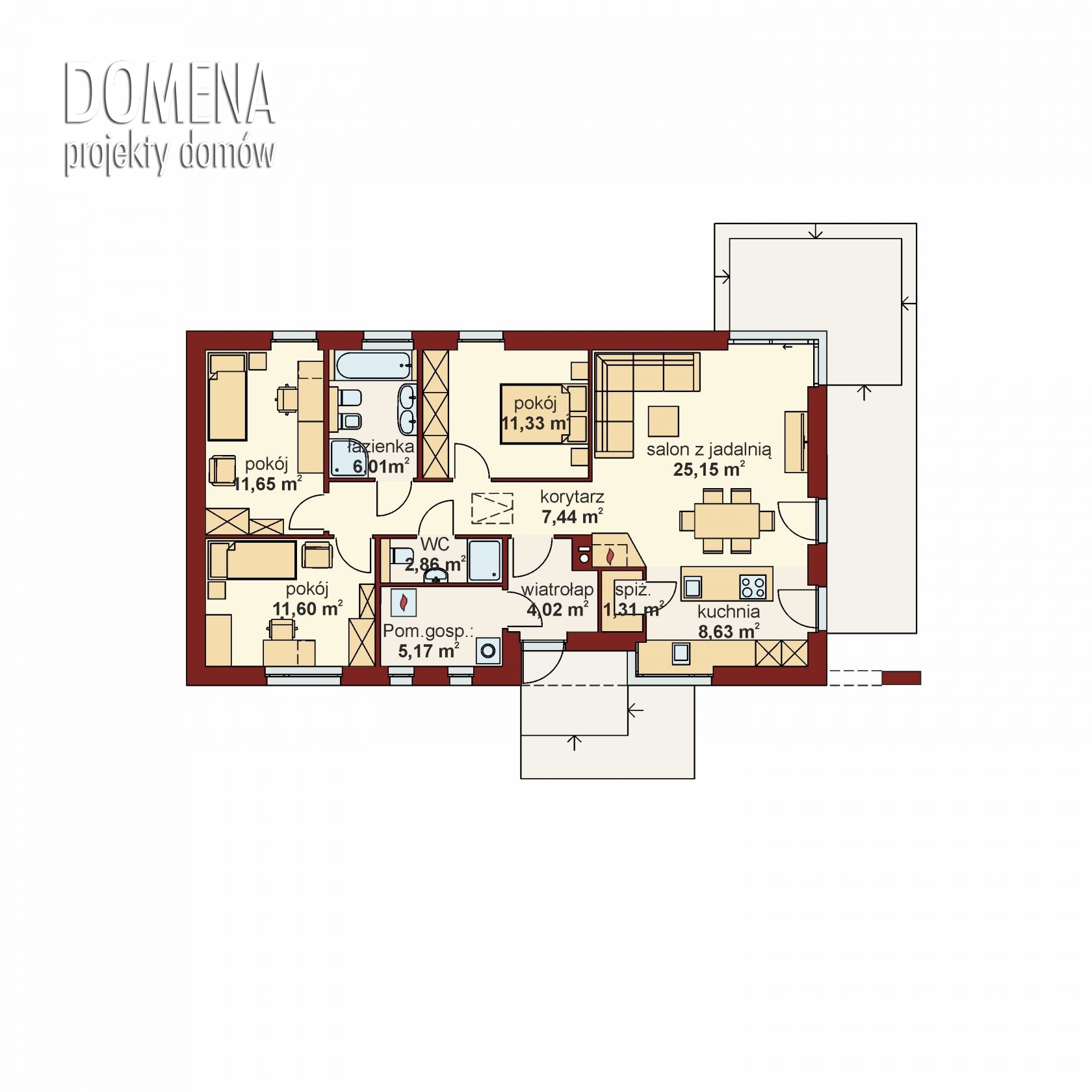 Przedsionek z miejscem na szafę otwiera się na strefę dzienną, składającą się z salonu połączonego z jadalnią oraz kuchni ze spiżarnią. Z korytarza mamy dostęp do strefy prywatnej - trzech sypialni, łazienki i WC. Plan domu uzupełnia pom. gosp z wejściem z wiatrołapu.