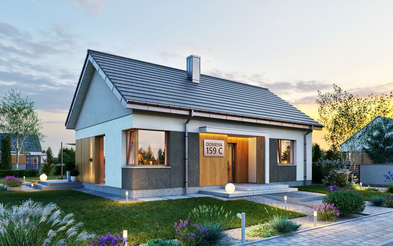 Wizualizacja jest propozycją tego jak dany projekt domu oraz jego otoczenie można zaaranżować. Sposób prowadzenia tarasu, kształt murków i elementy małej architektury typu pergole, donice itp. nie są objęte zakresem projektu. W związku z powyższym na projekcie budowlanym elementy te mogą nie być uwzględnione w projekcie ( patrz pergole ) lub zmieniony może być ich kształt i sposób prowadzenia ( wielkości tarasów, profil murków )