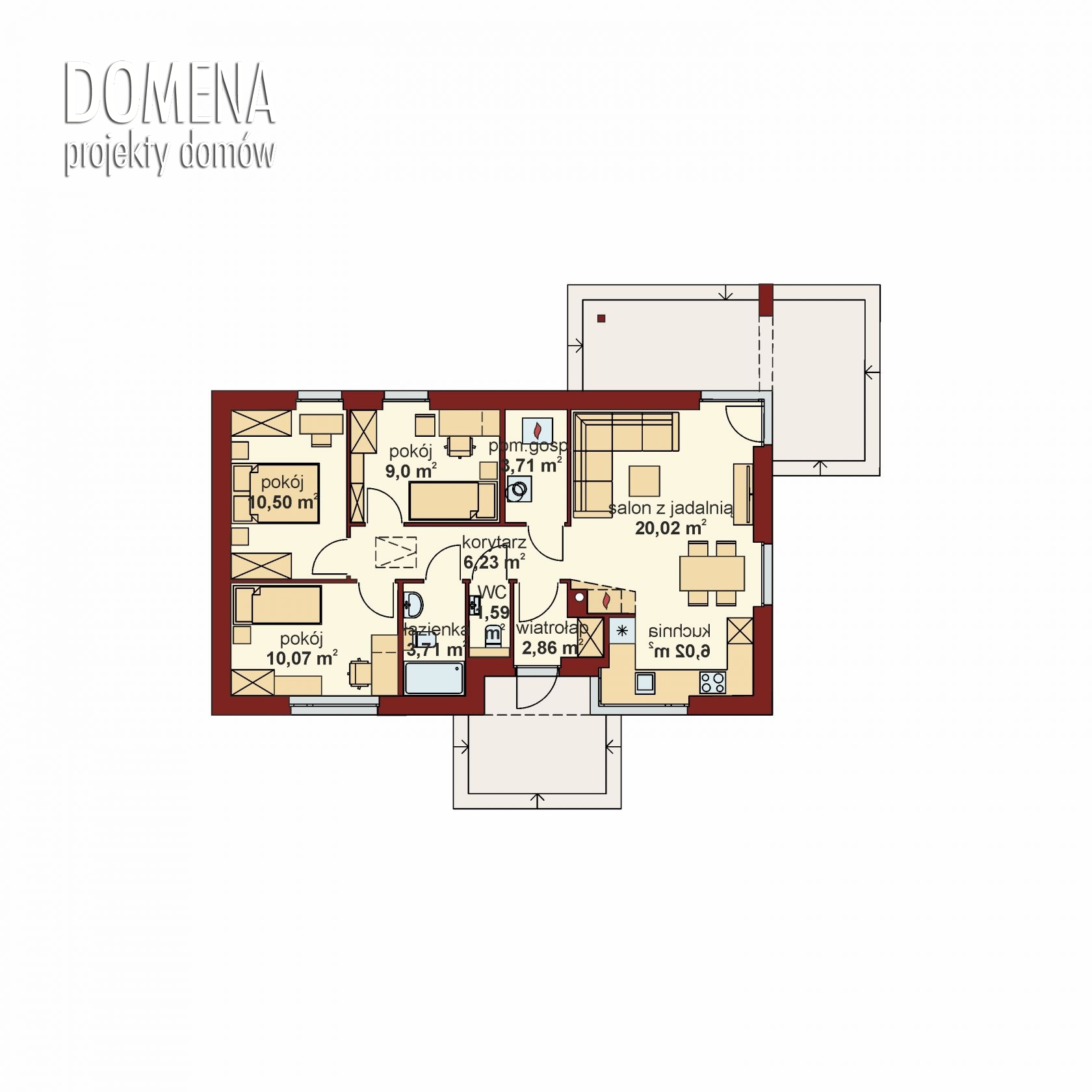 DOMENA 153 C, przedsionek z miejscem na szafę otwiera się na strefę dzienną, składającą się z przestronnego salonu połączonego z jadalnią oraz kuchni.. Z korytarza mamy dostęp do strefy prywatnej - trzech sypialni ,łazienki oraz WC . Plan domu uzupełnia dostępne naprzeciw wiatrołapu pomieszczenie gospodarcze.