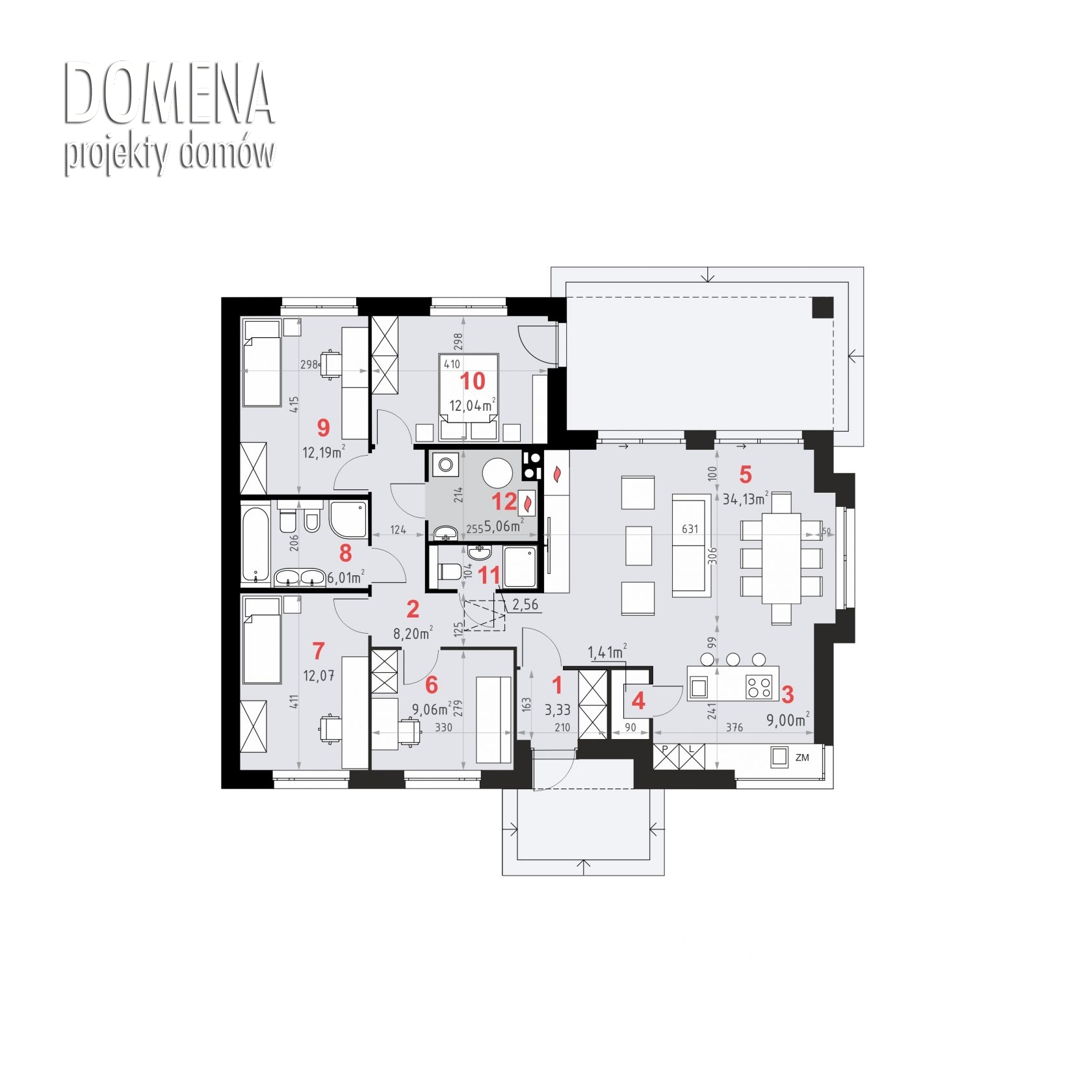 DOMENA 154 C, wiatrołap z miejscem na szafę otwiera się na strefę dzienną, składającą się z przestronnego salonu połączonego z jadalnią oraz kuchni ze spiżarnią. Z korytarza mamy dostęp do strefy prywatnej - trzech sypialni, gabinetu, pomieszczenia gospodarczego i dwóch łazienek.