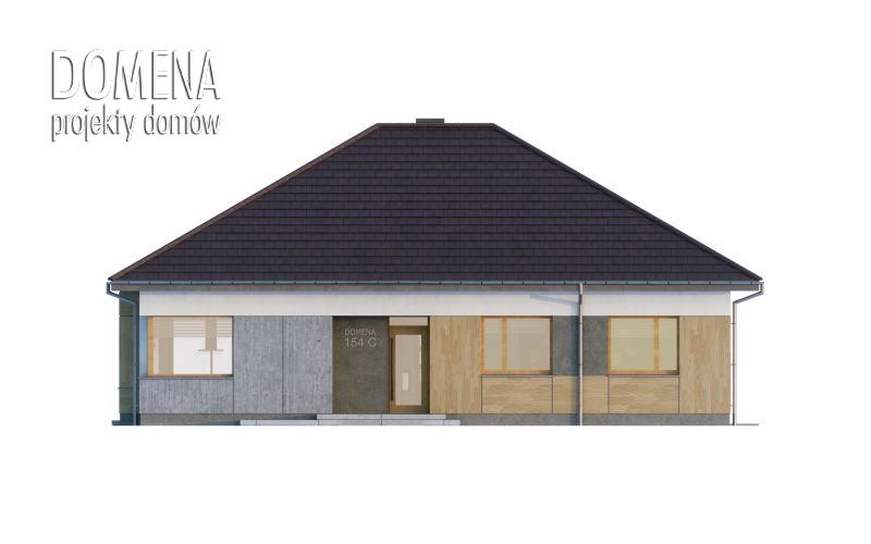 DOMENA 154 C, wiatrołap z miejscem na szafę otwiera się na strefę dzienną, składającą się z przestronnego salonu połączonego z jadalnią oraz kuchni ze spiżarnią. Z korytarza mamy dostęp do strefy prywatnej - trzech sypialni, gabinetu, pomieszczenia gospodarczego i dwóch łazienek.