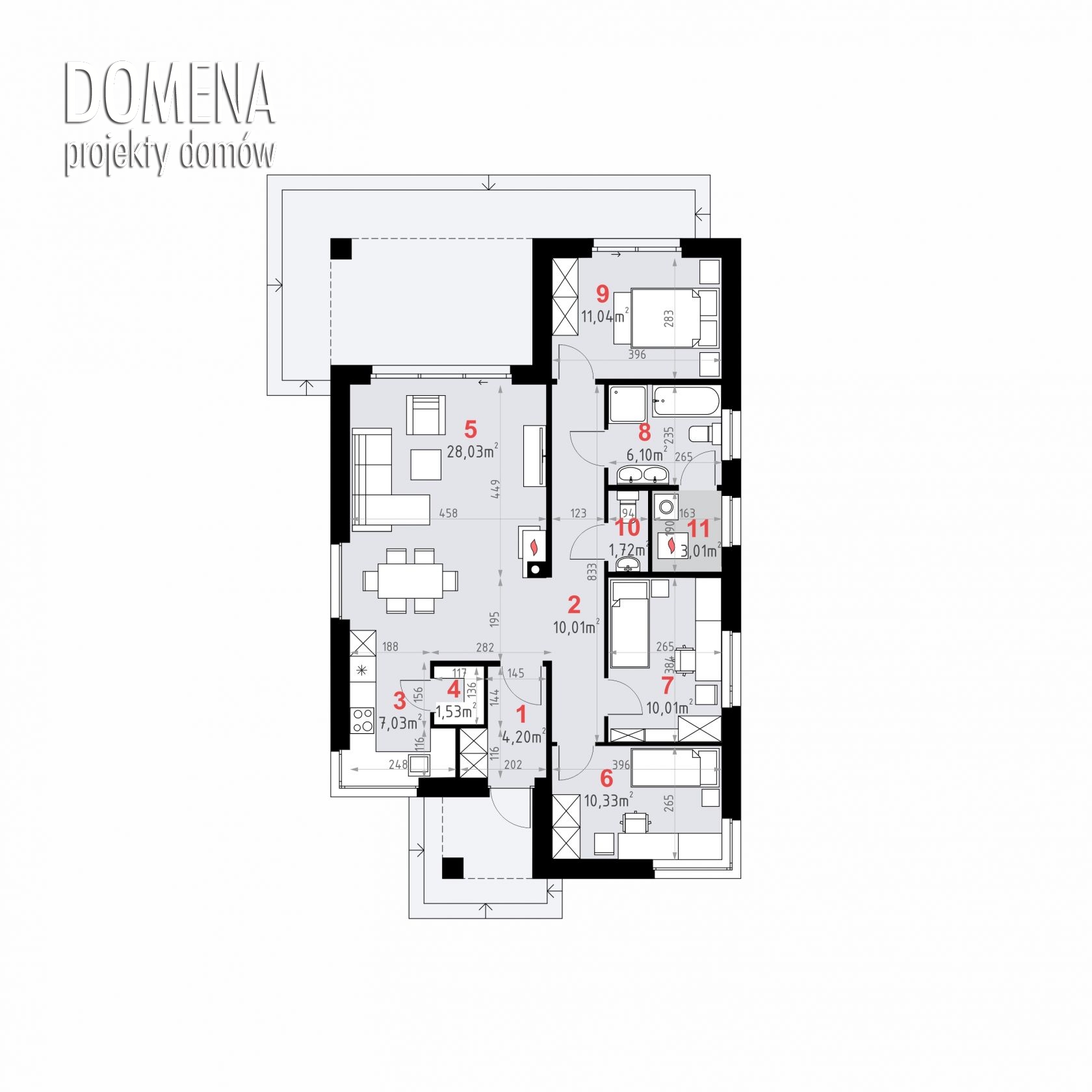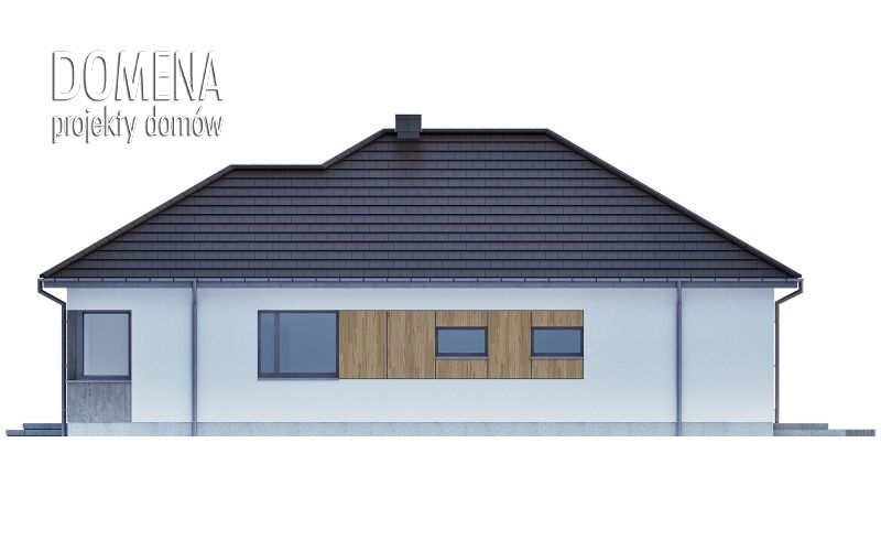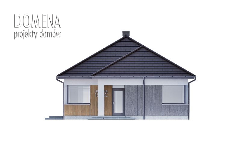 DOMENA 155 C, wiatrołap z miejscem na szafę otwiera się na strefę dzienną, składającą się z przestronnego salonu połączonego z jadalnią oraz kuchni ze spiżarnią. Z korytarza mamy dostęp do strefy prywatnej - trzech sypialni, pomieszczenia gospodarczego, łazienki i WC.