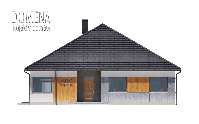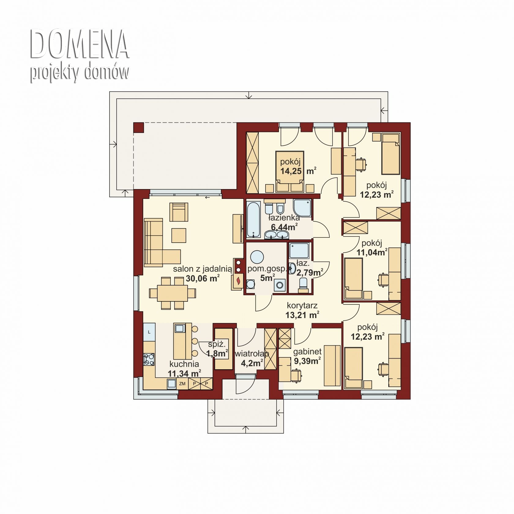 DOMENA 160 C, wiatrołap z miejscem na szafę otwiera się na strefę dzienną, składającą się z przestronnego salonu połączonego z jadalnią oraz kuchni ze spiżarnią. Z korytarza mamy dostęp do strefy prywatnej - czterech sypialni, gabinetu, kotłowni i dwóch łazienek.