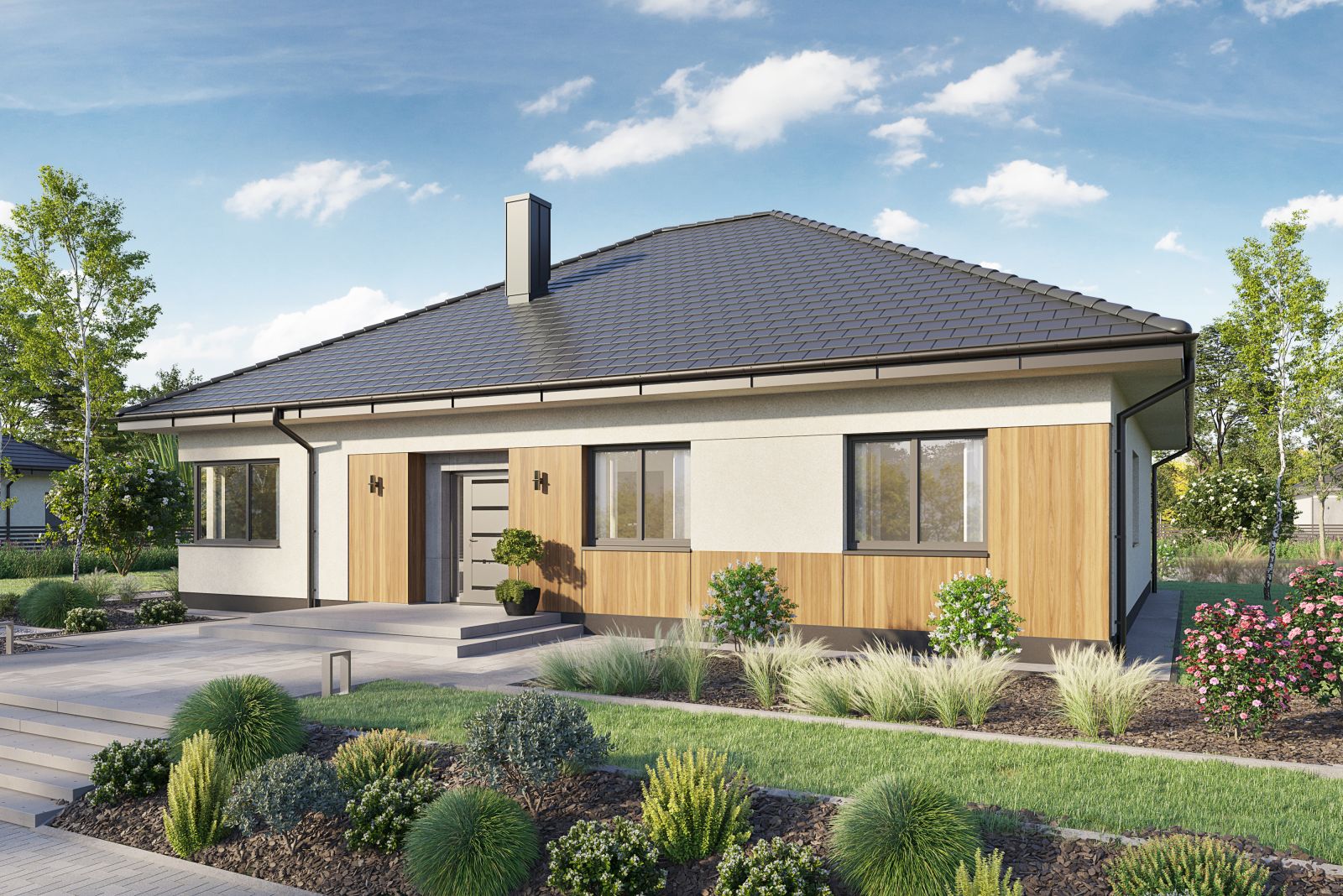 Wizualizacja jest propozycją tego jak dany projekt domu oraz jego otoczenie można zaaranżować. Sposób prowadzenia tarasu, kształt murków i elementy małej architektury typu pergole, donice itp. nie są objęte zakresem projektu. W związku z powyższym na projekcie budowlanym elementy te mogą nie być uwzględnione w projekcie lub zmieniony może być ich kształt i sposób prowadzenia ( wielkości tarasów, profil murków ).