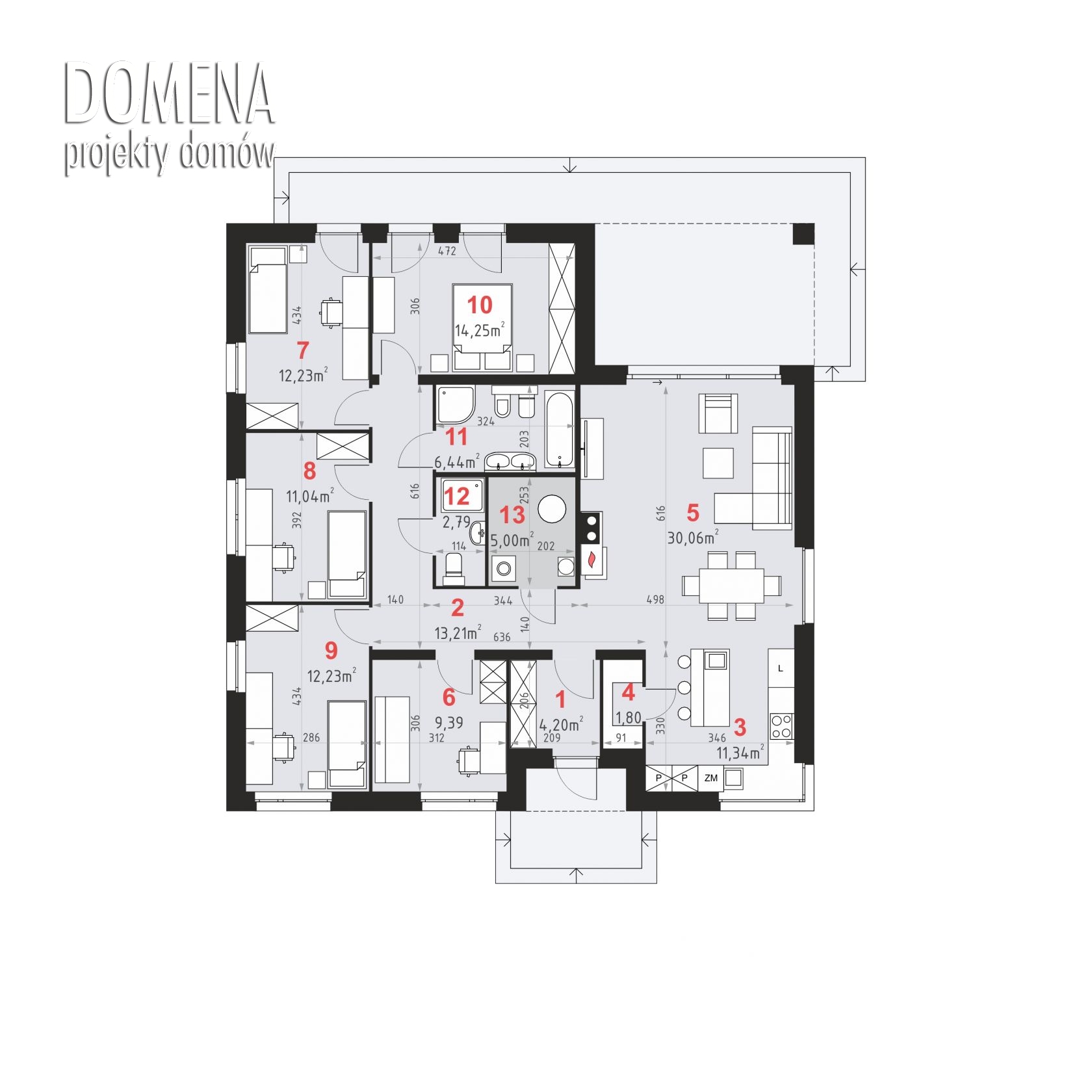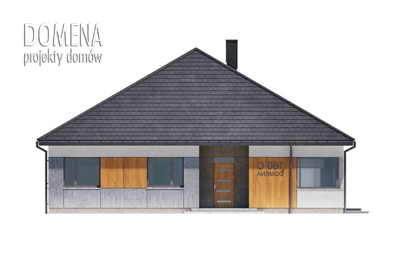 DOMENA 160 C, wiatrołap z miejscem na szafę otwiera się na strefę dzienną, składającą się z przestronnego salonu połączonego z jadalnią oraz kuchni ze spiżarnią. Z korytarza mamy dostęp do strefy prywatnej - czterech sypialni, gabinetu, kotłowni i dwóch łazienek.