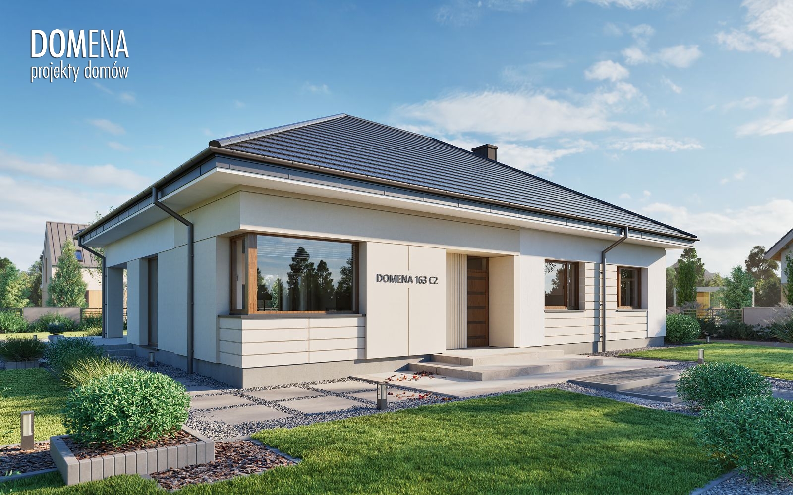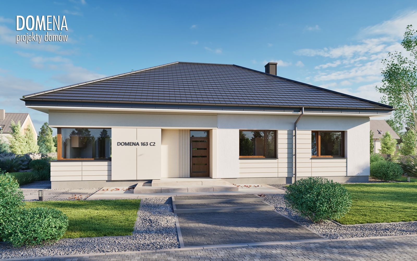 DOMENA 163 C2 to dom dla 4-5 osobowej rodziny. Przedsionek z miejscem na szafę otwiera się komunikacje. Strefa dzienna składa się z przestronnego salonu połączonego z jadalnią oraz kuchnią ze spiżarnią. Z funkcjonalnego holu mamy dostęp do sypialni z garderobą i lazienką, trzech pokoi oraz łazienki. W tej części znajduje się także pomieszczenie gospodarcze, pralnia i kotlownia. Pralnie mozna wykorzystac jako miejsca na schody na strych