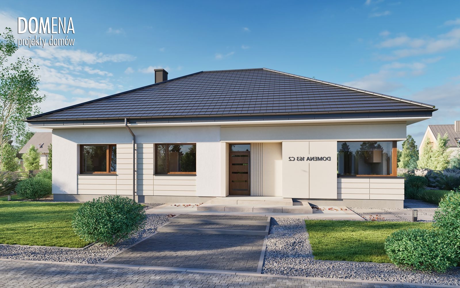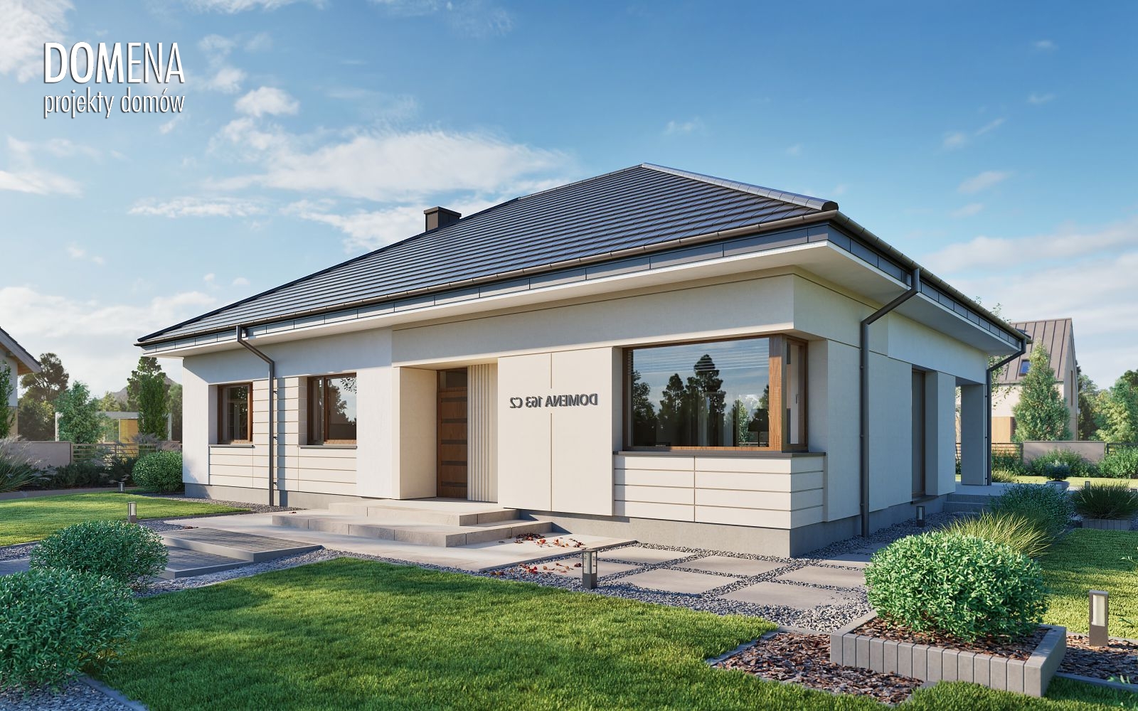 DOMENA 163 C2 to dom dla 4-5 osobowej rodziny. Przedsionek z miejscem na szafę otwiera się komunikacje. Strefa dzienna składa się z przestronnego salonu połączonego z jadalnią oraz kuchnią ze spiżarnią. Z funkcjonalnego holu mamy dostęp do sypialni z garderobą i lazienką, trzech pokoi oraz łazienki. W tej części znajduje się także pomieszczenie gospodarcze, pralnia i kotlownia. Pralnie mozna wykorzystac jako miejsca na schody na strych
