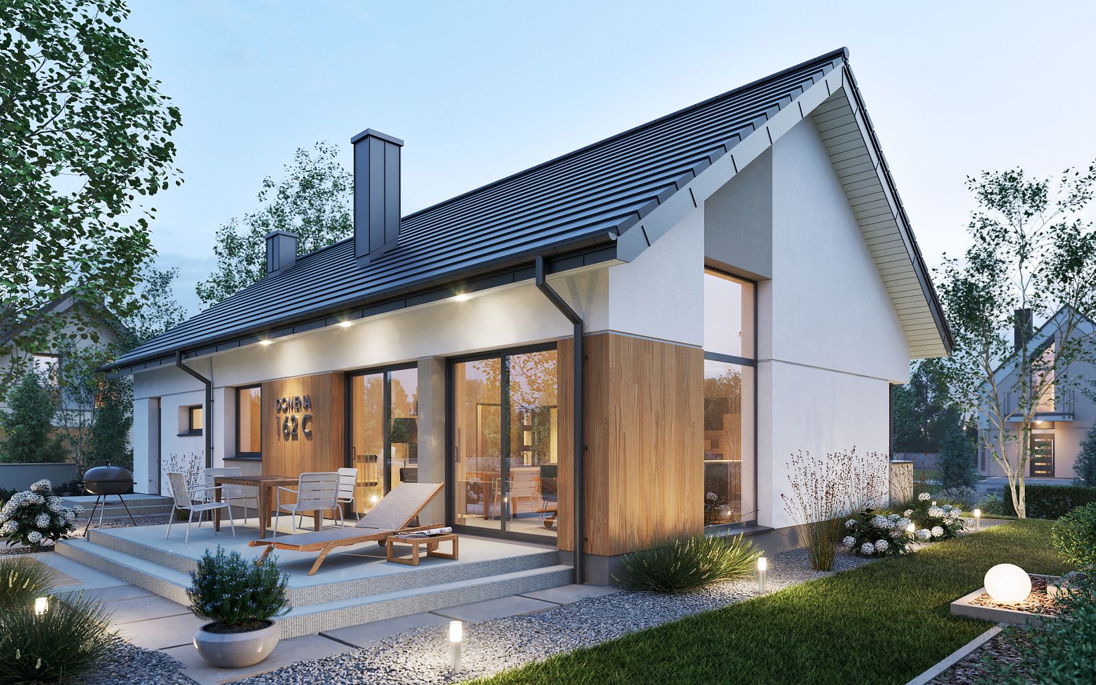 Wizualizacja jest propozycją tego jak dany projekt domu oraz jego otoczenie można zaaranżować. Sposób prowadzenia tarasu, kształt murków i elementy małej architektury typu pergole, donice itp. nie są objęte zakresem projektu. W związku z powyższym na projekcie budowlanym elementy te mogą nie być uwzględnione w projekcie ( patrz pergole ) lub zmieniony może być ich kształt i sposób prowadzenia ( wielkości tarasów, profil murków )