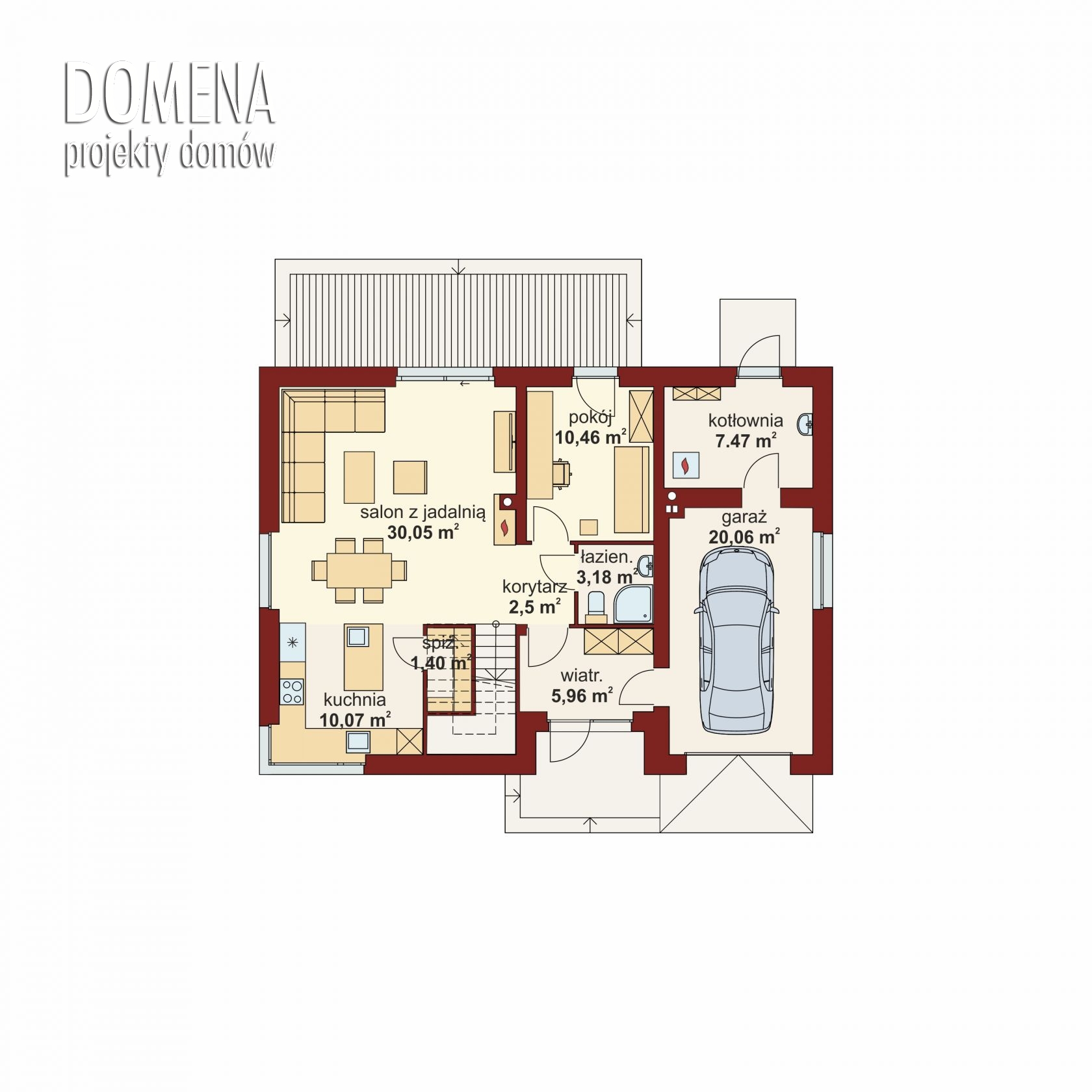 Przedsionek z miejscem na szafę otwiera się na strefę dzienną, składającą się z przestronnego salonu połączonego z jadalnią oraz kuchnią z wydzieloną spiżarnią. Z funkcjonalnego holu mamy dostęp na poddasze, do łazienki i dodatkowego pokoju, który może pełnić funkcję gabinetu. Część gospodarcza to garaż, poprzez który dostępne jest obszerne pomieszczenie gospodarcze (kotłownia) z wyjściem do ogrodu.