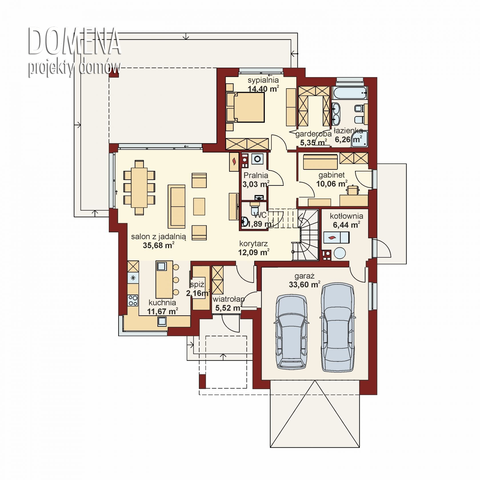 Przedsionek z miejscem na szafę otwiera się na strefę dzienną, składającą się z przestronnego salonu połączonego z jadalnią oraz kuchnią z wydzieloną spiżarnią. Z funkcjonalnego holu mamy dostęp na poddasze, do wc i pralni, dodatkowego pokoju, który może pełnić funkcję gabinetu oraz modułu składającego się z sypialni, garderoby i łazienki. Część gospodarcza to z dwustanowiskowy garaż, poprzez który dostępne jest obszerne pomieszczenie gospodarcze (kotłownia) z wyjściem do ogrodu.